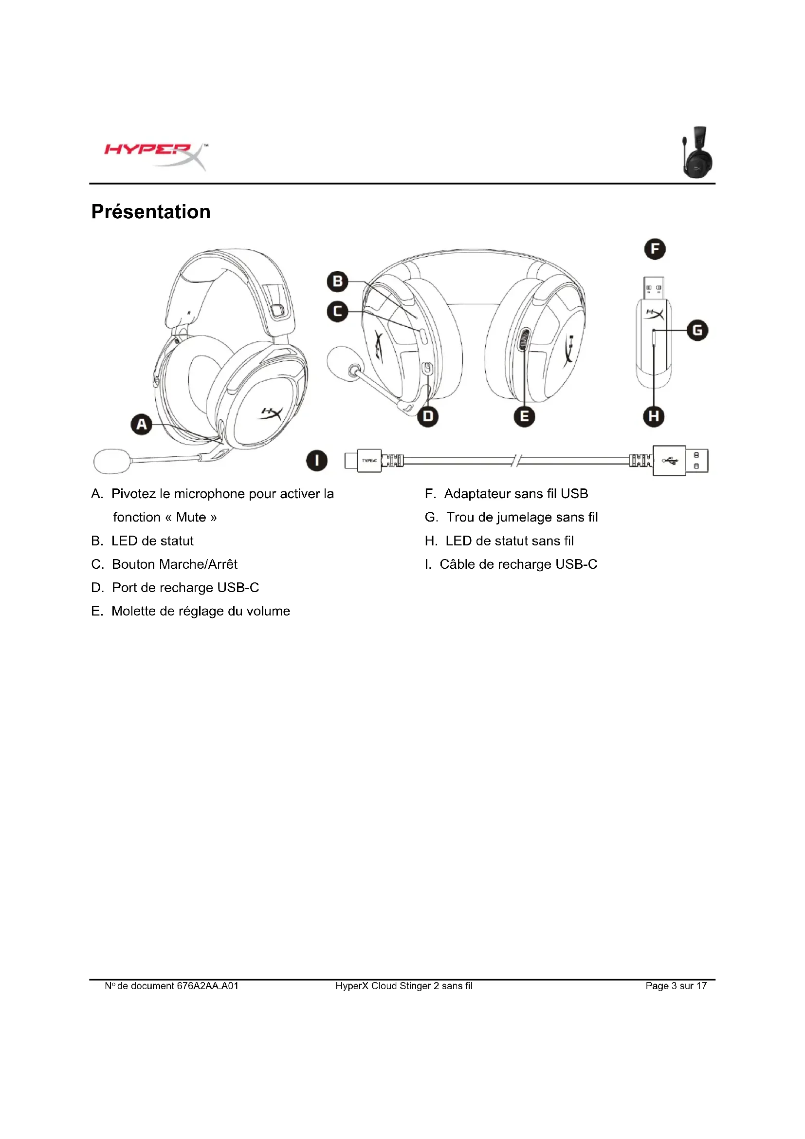 Présentation A. Pivotez le microphone pour activer la fonction « Mute » B. LED de statut C. Bouton Marche/Arrêt D. Port de recharge USB-C E. Molette de réglage du volume F. Adaptateur sans fil USB G. Trou de jumelage sans fil H. LED de statut sans fil