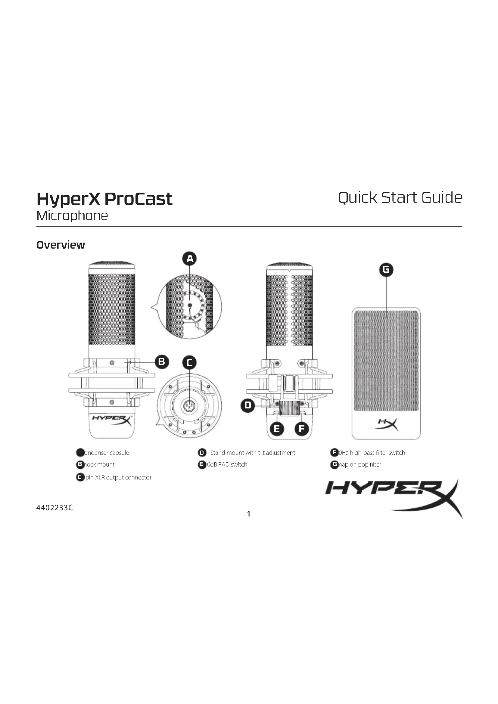 L’alimentation fantôme est nécessaire pour que l’HyperX ProCast fonctionne. Elle peut être fournie par le dispositif d’entrée audio ou par une alimentation en ligne séparée. Commutateurs L’activation du PAD (dispositif d’atténuation passif) de -10 dB augmentera la marge de sécurité du microphone de 10 dB en réduisant le niveau du signal du microphone avant qu’il n’atteigne la limite de distorsion électronique du microphone. Cela permet d’enregistrer des sources sonores plus fortes sans surcharger l’électronique du microphone et provoquer des L’activation du ltre passe-haut 80 Hz permet de ltrer les grondements ou autres basses fréquences indésirables sur la sortie du microphone. Le ltre réduira le niveau de sortie de 3 dB à 80 Hz et diminuera à un taux de 12 dB par octave. Stockage Lorsqu’il n’est pas utilisé, il est recommandé de ranger le microphone dans un environnement sec et de le recouvrir d’un sac en plastique pour empêcher la poussière ou d’autres particules d’atteindre la capsule. Spécications Des questions ou des problèmes de conguration ? Contacter l’équipe d’assistance HyperX ou consulter le manuel d’utilisation sur: hyperx.com/support ITALIANO Descrizione generale del prodotto A - Capsula del condensatore B - Supporto antiurto C - Connettore uscita XLR a 3-pin D - Supporto di montaggio con inclinazione regolabile Pattern polare HyperX ProCast ha un modello cardioide di pick-up in cui l'area direttamente a contatto con la parte anteriore del microfono risulta essere la più sensibile al suono. Ciò risulta particolarmente utile per ridurre i rumori di fondo o altri suoni indesiderati, oltre che per controllare il feedback durante il monitoraggio con gli altoparlanti. 10dB PADPAD -10dB désactivéPAD -10dB activé 0dB -10dBFILTRE PASSEHAUT 80HzFiltre passe-haut 80Hz activéFiltre passe-haut 80Hz désactivéCondensateur à polarisation externeà pulvérisation d'orÉlémentDiamètre du diaphragme 1”Modèle(s) polaire(s) CardioïdeRéponse en fréquence 20Hz~20kHzSensibilité -38 ± 3dBV (1V/Pa à1kHz) 3dBVBruit propre (RMS) 13,8 dB (pondéré A) Gamme dynamique 123dBRapport signal-bruit 75 dBImpédance de sortie 160 ΩFiltre anti-pop Métal, à enclenchementIntégréType de connexion Symétrique XLR mâle à 3 brochesDispositif d’atténuation passif (PAD) -10dBFiltre passe-haut -3dB@80Hz, -12dB/Oct.Poids total 507 gDimensions 134L * 102l * 209H (mm)Poids(Support antichoc et ltre anti-soue)127 gPoids (Microphone) 380 gCaractéristiques de l'alimentation fantôme 48VCC, 3mA typiqueSupport antichocNiveau sonore en entrée maximum 140dBSPL (THD 1%@1kHz)Spécications du microphoneConnexions et fonctionnalitésContrôlesSpécications physiques E - Commutateur PAD -10 dB F - Commutateur de ltre passe-haut 80 Hz G - Filtre anti-soue encliquetable E - Interruttore PAD -10dB F - Interruttore ltro passa alti 80 Hz G - Filtro anti-pop a innesto Installazione e posizionamento