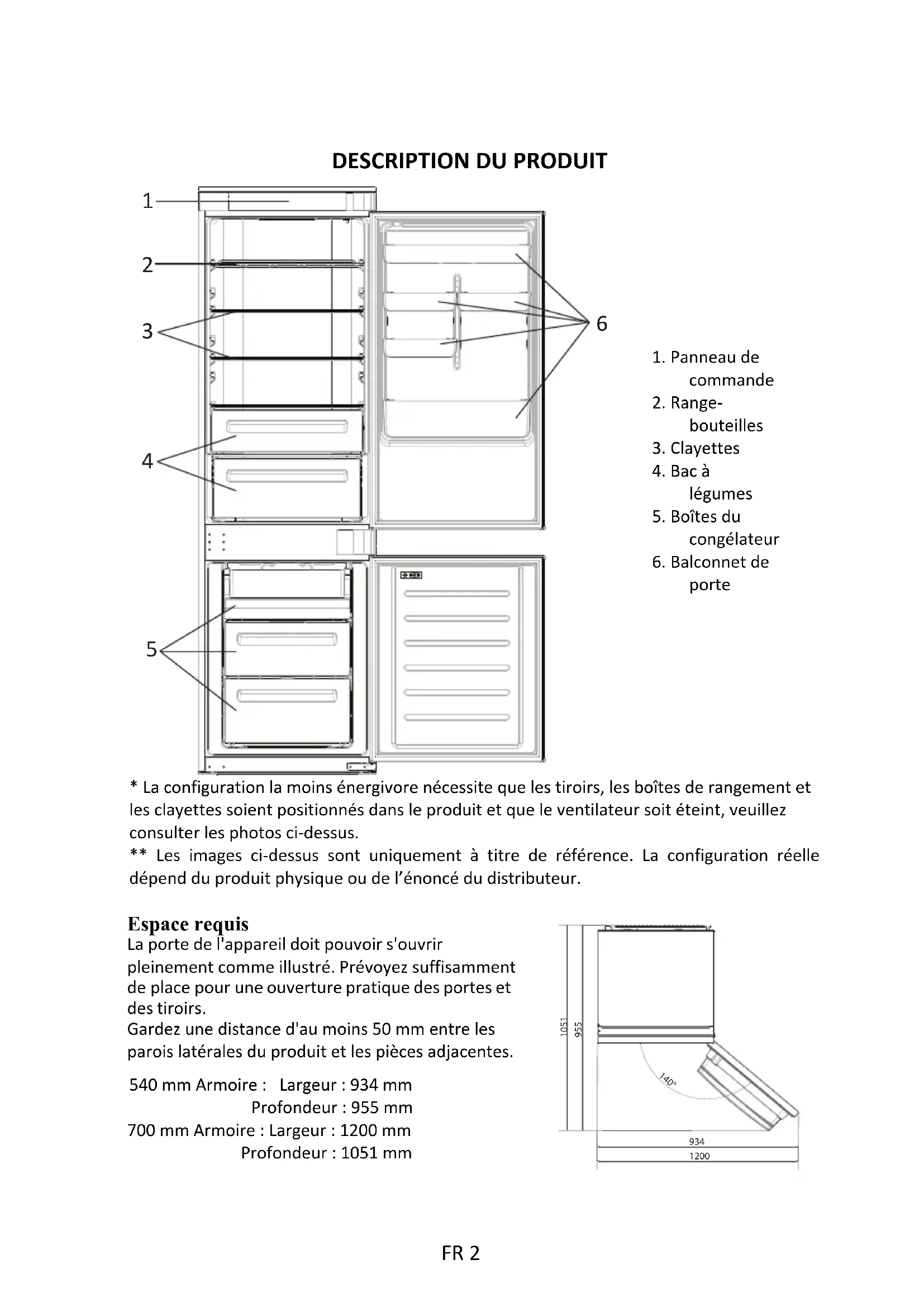 1. Panneau decommande2. Range-bouteilles3. Clayettes4. Bac àlégumes5. Boîtes ducongélateur6. Balconnet deporte* La configuration la moins énergivore nécessite que les tiroirs, les boîtes de rangement etles clayettes soient positionnés dans le produit et que le ventilateur soit éteint, veuillezconsulter les photos ci-dessus.** Les images ci-dessus sont uniquement à titre de référence. La configuration réelledépend du produit physique ou de l’énoncé du distributeur.Espace requis La porte de l'appareil doit pouvoir s'ouvrir pleinement comme illustré. Prévoyez suffisamment de place pour une ouverture pratique des portes et des tiroirs. Gardez une distance d'au moins 50 mm entre les parois latérales du produit et les pièces adjacentes.