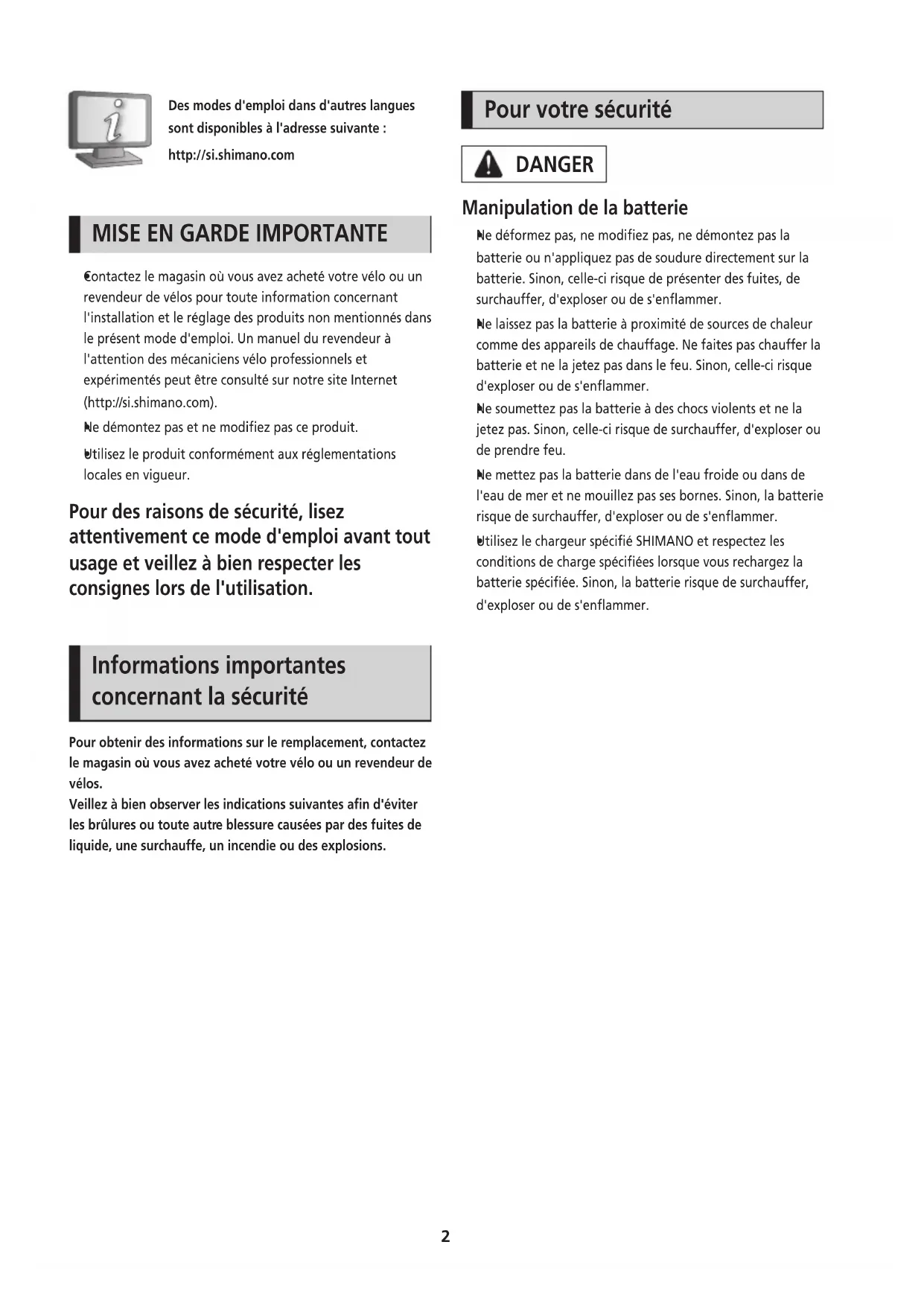 Utilisez le produit conformément aux réglementations locales en vigueur. Pour des raisons de sécurité, lisez attentivement ce mode d'emploi avant tout usage et veillez à bien respecter les consignes lors de l'utilisation. Informations importantes concernant la sécurité Pour obtenir des informations sur le remplacement, contactez le magasin où vous avez acheté votre vélo ou un revendeur de vélos. Veillez à bien observer les indications suivantes afin d'éviter les brûlures ou toute autr e blessure causées par des fuites de liquide, une surchauffe, un incendie ou des explosions. Pour votre sécurité DANGER Manipulation de la batterie