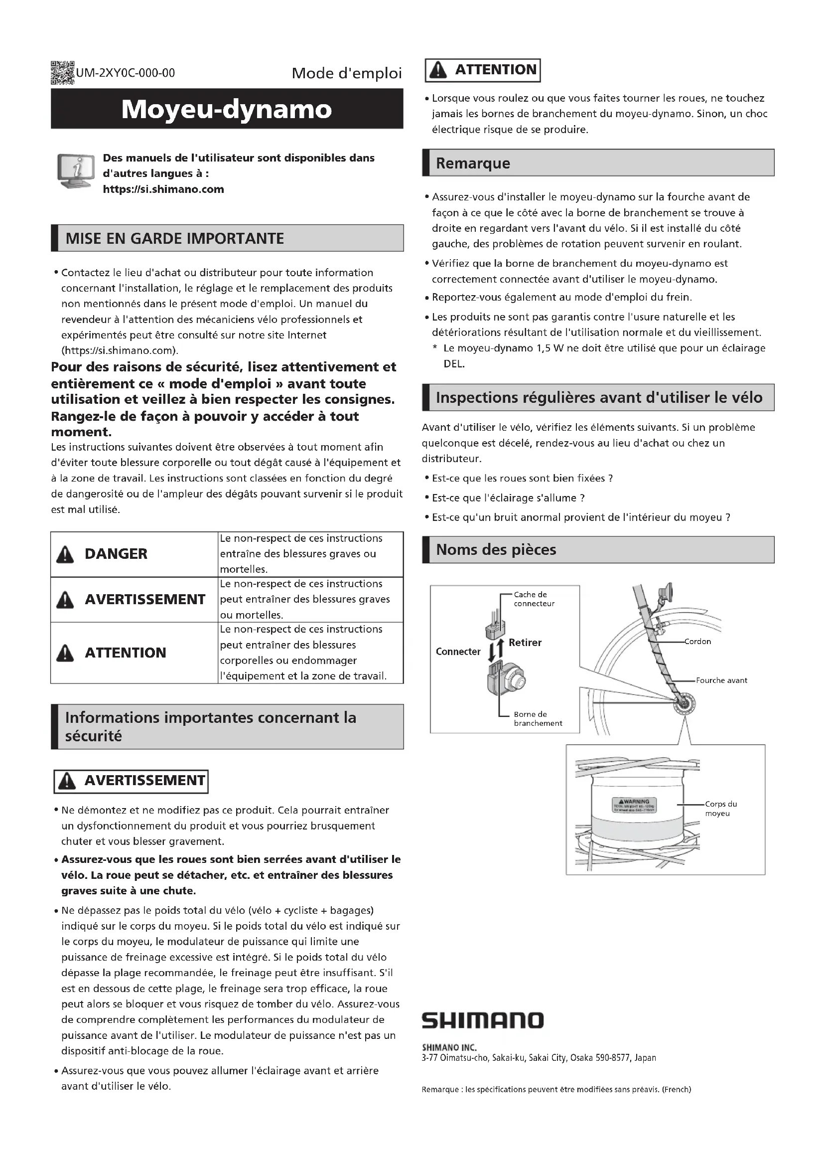 Est-ce qu'un bruit anormal provient de l'intérieur du moyeu? Noms des pièces Cache de connecteurRetirerConnecterBorne de branchementCordonFourche avantCorps du moyeuRemarque : les spécifications peuvent être modifiées sans préavis. (French) UM-2XY0C-000-00 Mode d'emploi 3-77 Oimatsu-cho, Sakai-ku, Sakai City, Osaka 590-8577, Japan