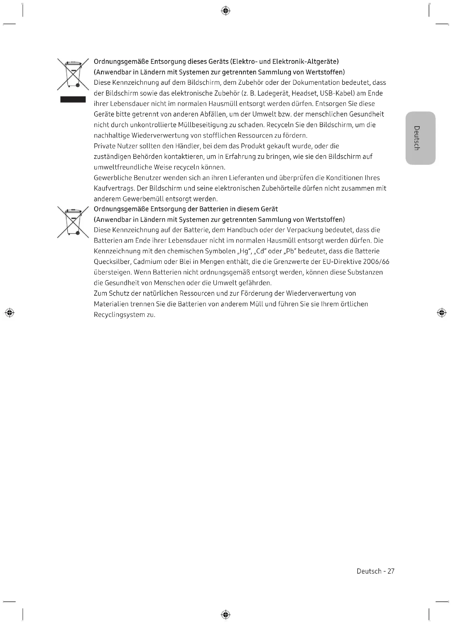 - Vous pouvez voir la plaque signalétique attachée à l'arrière du téléviseur. (Sur certains modèles, vous pouvez voir la plaque signalétique à l'intérieur de la coque de protection.) Réduction de la consommation d'énergie Lorsque vous éteignez le téléviseur, il passe en mode veille. En mode veille, le téléviseur continue à consommer une petite quantité de courant. Pour réduire la consommation d'énergie, débranchez le cordon d'alimentation lorsque vous prévoyez de ne pas utiliser le téléviseur pendant une période prolongée.Français - 26 Licences The terms HDMI and HDMI High-Definition Multimedia Interface, and the HDMI Logo are trademarks or registered trademarks of HDMI Licensing LLC in the United States and other countries. Recommandation - UE uniquement Par la présente, SamsungElectronics déclare que cet équipement est conforme à la directive 2014/53/EU. Le texte intégral de la déclaration de conformité de l’UE est disponible à l'adresse internet suivante: http:// www.samsung.com, sélectionnez Assistance et entrez le nom du modèle. Cet équipement peut fonctionner dans tous les pays de l'UE. La fonction WLAN 5 GHz (Wi-Fi) de cet équipement ne peut être utilisée qu'en intérieur. Puissance de transmission BT max.: 100mW à 2,4GHz–2,4835GHz Puissance de transmission Wi-Fi max.: 100mW à 2,4GHz-2,4835GHz, 200mW à 5,15GHz-5,25GHz, 100mW à 5,25GHz-5,35GHz & 5,47GHz - 5,725GHz Pour en savoir plus sur les engagements de Samsung en matière d'environnement et les obligations réglementaires spécifiques à un produit (REACH, DEEE, piles, etc.), rendez-vous sur http://www.samsung.com/ uk/aboutsamsung/samsungelectronics/corporatecitizenship/data_corner.html ATTENTION: POUR EVITER TOUT RISQUE D'INCENDIE, TENEZ TOUJOURS CE PRODUIT A DISTANCE DES BOUGIES OU AUTRES FLAMMES OUVERTES.Français - 27 Français Instructions de mise au rebut de ce produit (déchets d'équipements électriques & électroniques) (Applicable dans les pays pratiquant la collecte sélective de déchets) Ce symbole présent sur le produit, ses accessoires ou sa documentation indique que ni le produit, ni ses accessoires électroniques usagés (chargeur, casque audio, câble USB, etc.) ne peuvent être jetés avec les autres déchets ménagers. La mise au rebut incontrôlée des déchets présentant des risques pour l'environnement et la santé publique, veuillez séparer vos produits et accessoires usagés des autres déchets. Vous favoriserez ainsi le recyclage de la matière qui les compose dans le cadre d'un développement durable. Les particuliers sont invités à contacter le magasin leur ayant vendu le produit ou à se renseigner auprès des autorités locales pour connaître les procédures et les points de collecte de ces produits en vue de leur recyclage. Les utilisateurs professionnels doivent contacter leur fournisseur et consulter les conditions générales du contrat d'achat. Ce produit et ses accessoires ne peuvent être jetés avec les autres déchets professionnels et commerciaux. Mise au rebut des piles de ce produit (Applicable dans les pays pratiquant la collecte sélective de déchets) Le symbole présent sur le manuel, l'emballage ou les piles indique que celles-ci ne doivent pas être éliminées en fin de vie avec les autres déchets ménagers. Le cas échéant, les symboles chimiques Hg, Cd ou Pb signifient que la pile contient du mercure, du cadmium ou du plomb à des niveaux supérieurs aux niveaux de référence indiqués dans la directive CE 2006/66. Si les piles ne sont pas correctement éliminées, ces substances peuvent causer des dommages à la santé humaine ou l'environnement. Afin de protéger les ressources naturelles et de favoriser la réutilisation du matériel, veillez à séparer les piles des autres types de déchets et à les recycler via votre système local de collecte gratuite des piles et accumulateurs.Italiano - 2 Prima di leggere questo manuale dell'utente Questo TV viene venduto con un manuale dell'utente ed un manuale elettronico. Prima di leggere questo manuale, vedere: Manuale dell'utente Leggere questo manuale in dotazione per visualizzare le informazioni sulla sicurezza dei prodotti, installazione, accessori, configurazione iniziale e specifiche del prodotto. e-Manual Per maggiori informazioi su questo TV, leggere il e-Manual incorporato nel prodotto.