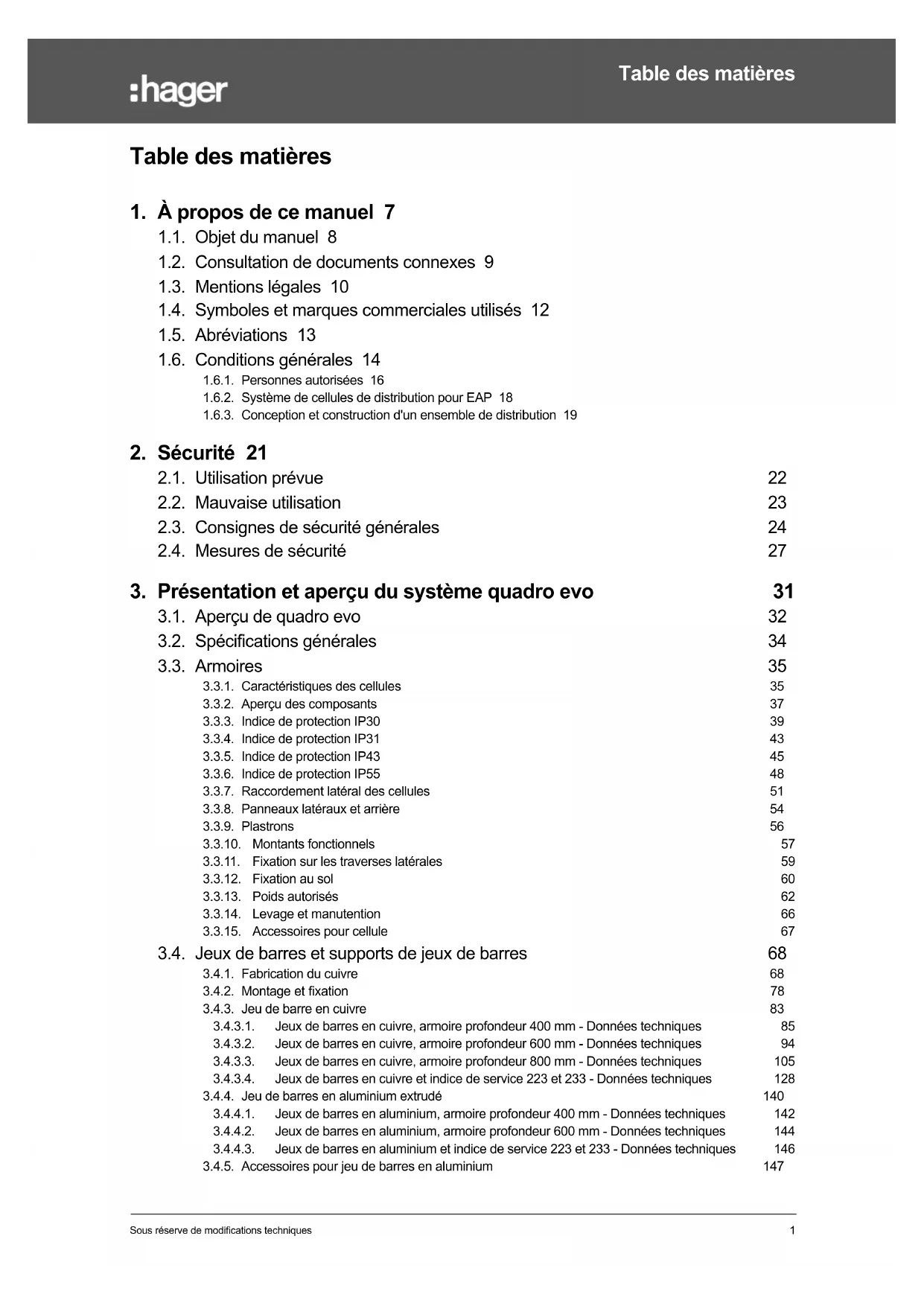 Indice de mobilité • 168 Indice de protection IP30 • 39 Indice de protection IP31 • 43 Indice de protection IP43 • 45 Index Indice de protection IP55 • 48 Indice de service • 169 Informations et caractéristiques techniques de quadro evo • 289 Informations générales • 257 Installation • 381 Installation de l'équipement • 267, 268 Interrupteur sectionneur + inverseur de source (ATS) • 217 Interrupteur sectionneur 630 A ≤ arrivée 1600 A • 340 Interrupteur sectionneur fusibles HFD • 225