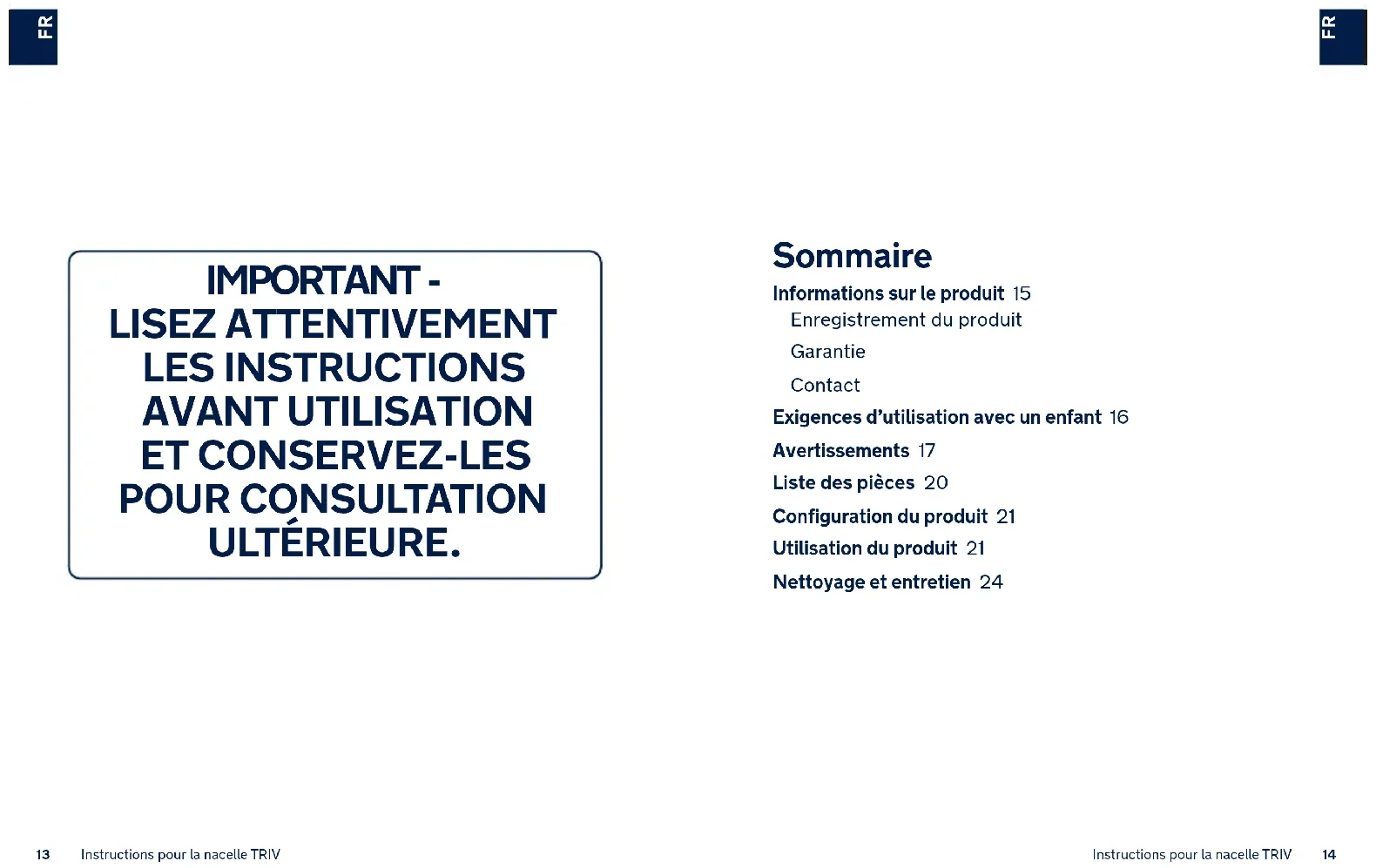 Sommaire Informations sur le produit 15 Enregistrement du produit Garantie Contact Exigences d’utilisation avec un enfant 16 Avertissements 17 Liste des pièces 20 Configuration du produit 21 Utilisation du produit 21 Nettoyage et entretien 24 IMPORTANT - LISEZ ATTENTIVEMENT LES INSTRUCTIONS AVANT UTILISATION ET CONSERVEZ-LES POUR CONSULTATION ULTÉRIEURE.15 Instructions pour la nacelle TRIV 16Instructions pour la nacelle TRIV