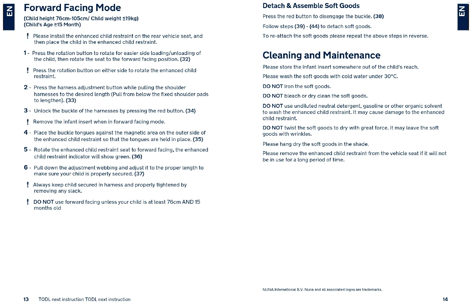 assurer que votre enfant est correctement attaché. (37) Maintenez toujours l'enfant attaché dans le harnais et correctement serré en éliminant le jeu éventuel. NE PAS utiliser en mode face à l’avant si votre enfant ne mesure pas au moins 76 cm ET a moins de 15 mois. Détacher et assembler les pièces souples Appuyez sur le bouton rouge pour désengager la boucle. (38) Suivez les étapes (39) - (44) pour détacher les parties souples. Pour fixer à nouveau les parties souples, veuillez répéter les étapes ci-dessus dans l'ordre inverse. Nettoyage et maintenance Rangez l'insert pour bébé dans un endroit hors de portée de l'enfant. Lavez les pièces souples à l'eau froide à moins de 30 C. NE PAS repasser les pièces souples. NE PAS nettoyer les pièces souples à sec ou à l'eau de Javel. NE PAS utiliser de détergents neutres non dilués, de l'essence ou d'autres solvants organiques pour laver le dispositif de retenue pour enfants amélioré. Cela pourrait endommager le dispositif de retenue pour enfants amélioré. NE PAS essorer les pièces souples avec trop de force. Des plis pourraient apparaître sur les pièces souples. Laissez les pièces souples sécher à l'ombre. Veuillez retirer le dispositif de retenue pour enfants amélioré du véhicule si vous ne prévoyez pas de l'utiliser pendant une longue période. NUNA International B.V. Nuna et tous les logos associés sont des marques déposées.3029 Anleitung zu TODL next Anleitung zu TODL next