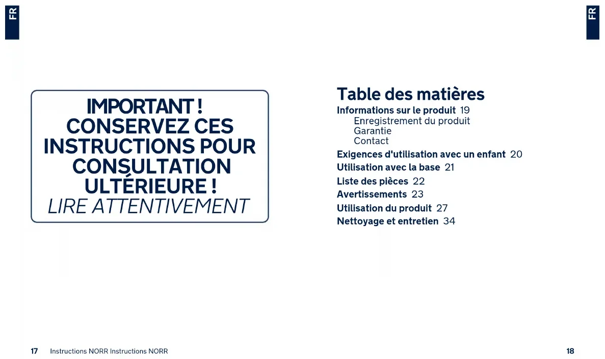 FRInformations sur le produit Numéro de modèle : ________________________________________________ Date de Fabrication : _______________________________________________ Enregistrement du produit Veuillez indiquer les informations ci-dessus. Le numéro de modèle et la date de fabrication se situent sur la partie inférieure du NORR. Pour enregistrer votre produit, veuillez vous rendre sur le site suivant : www.nunababy.com Cliquez sur le lien « Enregistrement du matériel » dans la page d’accueil. Garantie Nous avons conçu spécialement nos produits de haute qualité afin qu'ils puissent accompagner le développement de votre enfant et de votre famille. Nous soutenons notre produit en couvrant notre matériel par une garantie personnalisée, commençant le jour de son achat. Veuillez disposer de la preuve d'achat, du numéro de modèle et de la date de fabrication lorsque vous nous contactez. Pour des informations sur la garantie, veuillez visiter : www.nunababy.com Cliquez sur le lien « Garantie » dans la page d’accueil. Contact Pour des demandes de pièces de rechange, de service ou des questions supplémentaires sur la garantie, veuillez contacter notre service client. info@nunababy.com www.nunababy.com Exigences d’utilisation avec un enfant Ce produit convient aux enfants répondant aux exigences suivantes : Face à l’arrière : Taille de l’enfant 40cm-105cm / Poids de l’enfant ≤ 18kg Mode d'installation Mode bébé Taille entre 40 cm-105 cm / Poids ≤18 kg Installation Position inclinée 1-7