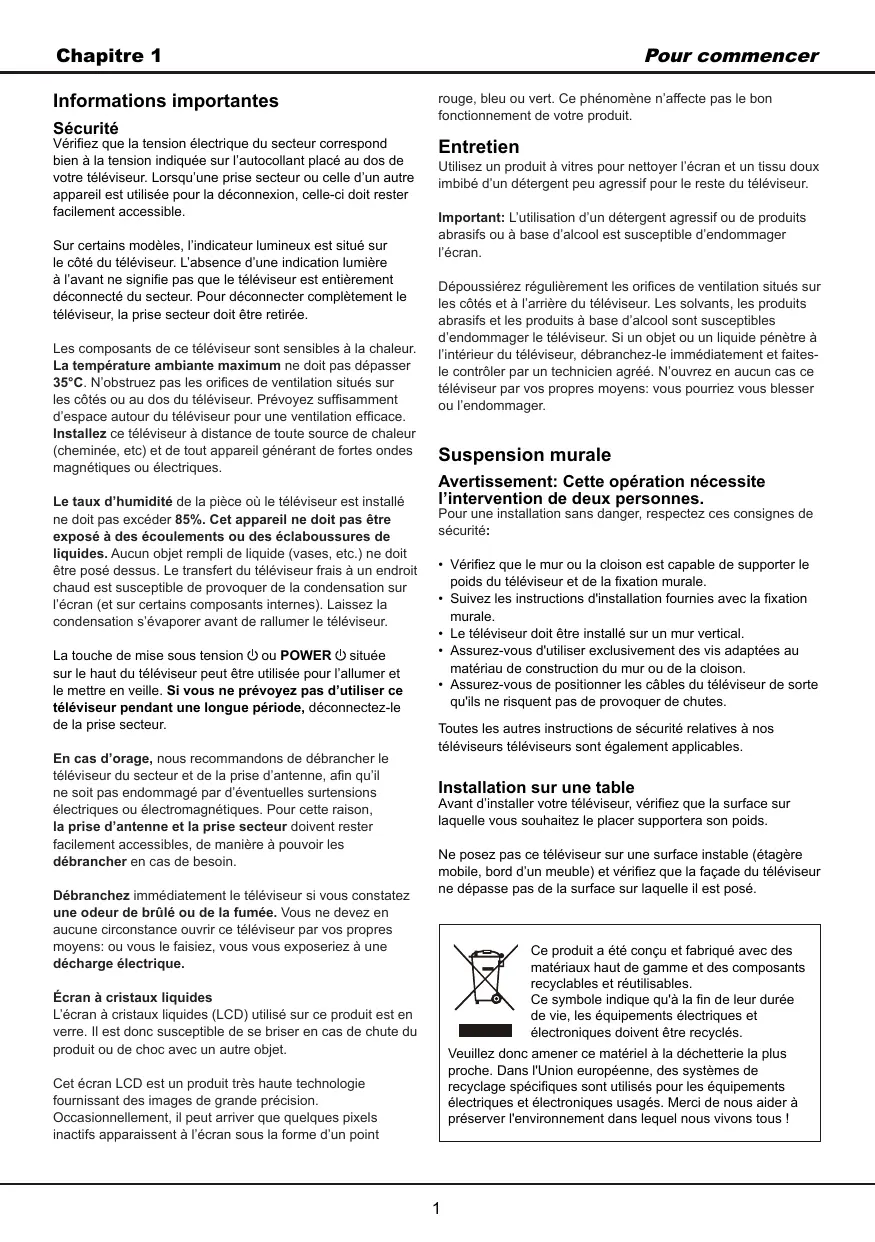 - Assurez-vous de positionner les câbles du téléviseur de sorte qu'ils ne risquent pas de provoquer de chutes. Toutes les autres instructions de sécurité relatives à nos téléviseurs téléviseurs sont également applicables. Installation sur une table Avant d’installer votre téléviseur, vérifiez que la surface sur laquelle vous souhaitez le placer supportera son poids. Ne posez pas ce téléviseur sur une surface instable (étagère mobile, bord d’un meuble) et vérifiez que la façade du téléviseur ne dépasse pas de la surface sur laquelle il est posé. Ce produit a été conçu et fabriqué avec des matériaux haut de gamme et des composants recyclables et réutilisables. Ce symbole indique qu'à la fin de leur durée de vie, les équipements électriques et électroniques doivent être recyclés. Écran à cristaux liquides L’écran à cristaux liquides (LCD) utilisé sur ce produit est en verre. Il est donc susceptible de se briser en cas de chute du produit ou de choc avec un autre objet. Veuillez donc amener ce matériel à la déchetterie la plus proche. Dans l'Union européenne, des systèmes de recyclage spécifiques sont utilisés pour les équipements électriques et électroniques usagés. Merci de nous aider à préserver l'environnement dans lequel nous vivons tous ! Cet écran LCD est un produit très haute technologie fournissant des images de grande précision. Occasionnellement, il peut arriver que quelques pixels inactifs apparaissent à l’écran sous la forme d’un point