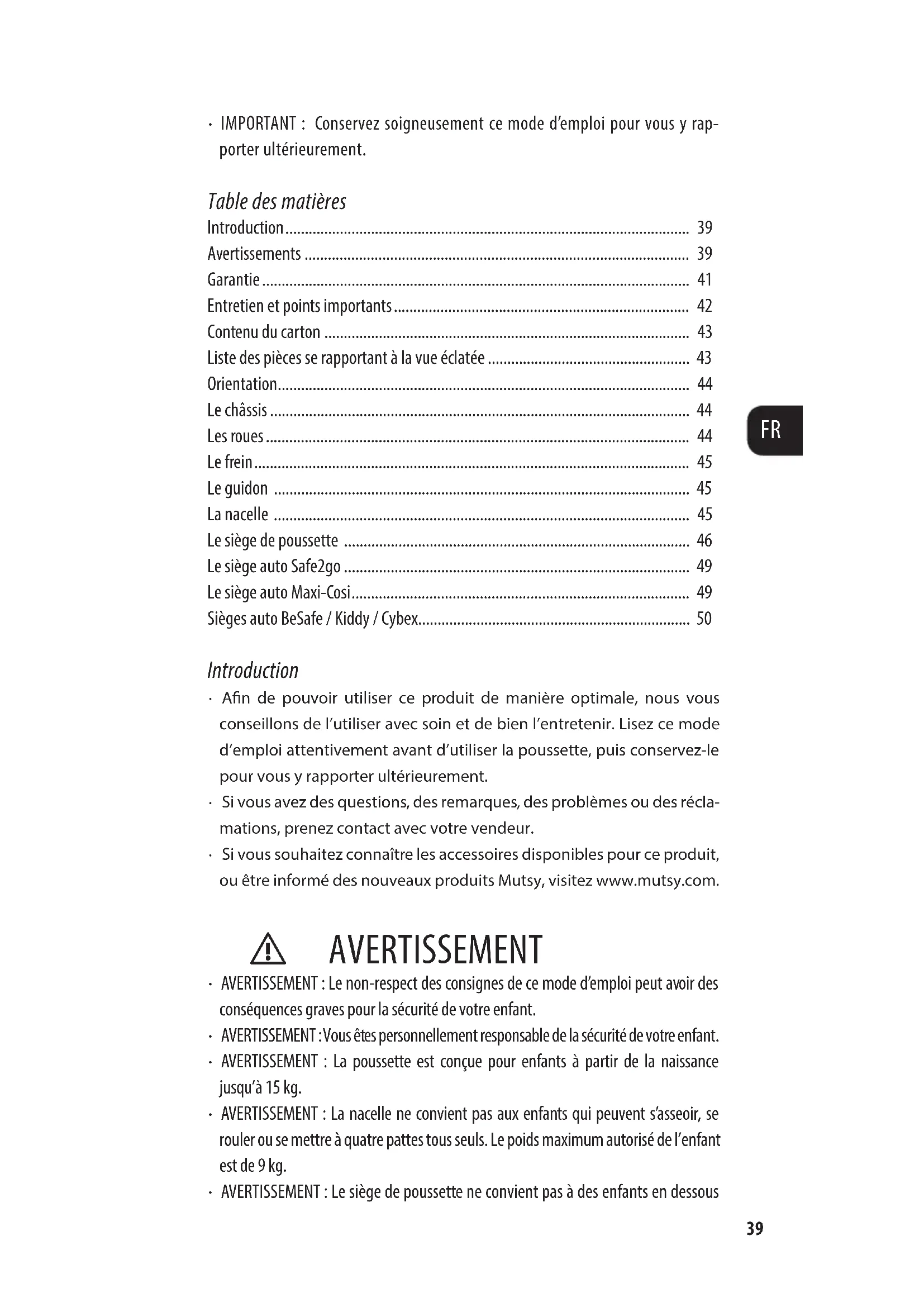 - Si vous souhaitez connaître les accessoires disponibles pour ce produit, ou être informé des nouveaux produits Mutsy, visitez www.mutsy.com. ⚠ AVERTISSEMENT