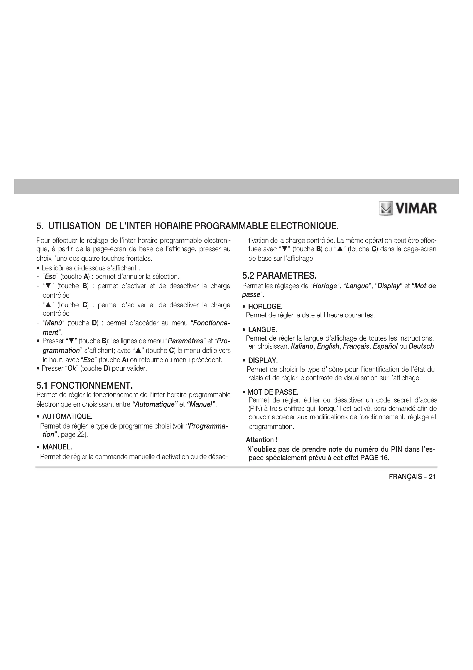 - MOT DE PASSE. Permet de régler, éditer ou désactiver un code secret d’accès (PIN) à trois chiffres qui, lorsqu’il est activé, sera demandé afin de pouvoir accéder aux modifications de fonctionnement, réglage et programmation. Attention ! N’oubliez pas de prendre note du numéro du PIN dans l’es- pace spécialement prévu à cet effet PAGE 16.22 - FRANÇAIS