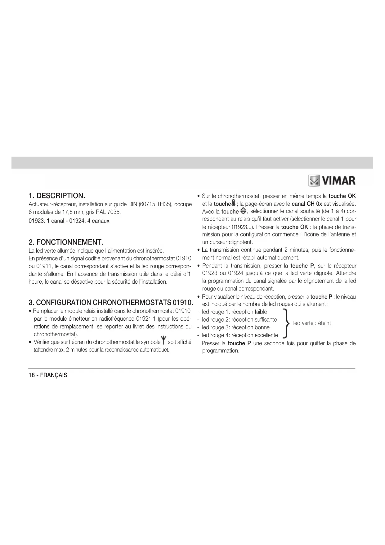La led verte allumée indique que l’alimentation est insérée. En présence d’un signal codifié provenant du chronothermostat 01910 ou 01911, le canal correspondant s’active et la led rouge correspon- dante s’allume. En l’absence de transmission utile dans le délai d’1 heure, le canal se désactive pour la sécurité de l’installation.