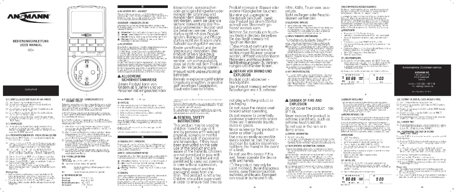 Cet appareil est une minuterie pour prise qui permet de com- mander la puissance électrique des appareils ménagers afi n d’économiser de l’énergie. Il dispose d‘un accu NiMH intégré (non remplaçable) pour le maintien des réglages programmés. Avant le fonctionnement, raccordez l’appareil à une prise pour le charger pendant env. 5 à 10 minutes. Si l’accu interne n’est plus chargé, rien ne s’affi che sur l’écran. Si l’appareil est débranché du secteur, l’accu chargé retient les valeurs programmées pendant env. 100 jours. FONCTIONS Affi chage alternatif 12 ou 24 heures Commutation facile entre l‘heure d’hiver et l‘heure d’été Jusqu‘à 10 programmes par jour pour la fonction d’activation et de coupure Réglage de l’heure avec HEURES, MINUTES et JOUR Réglage manuel de « Toujours ACTIF » ou « Toujours INACTIF » par un appui sur une touche Réglage aléatoire pour allumer et éteindre vos lumières à des heures aléatoires pendant votre absence Affi chage LED vert si la prise est active Sécurité enfant