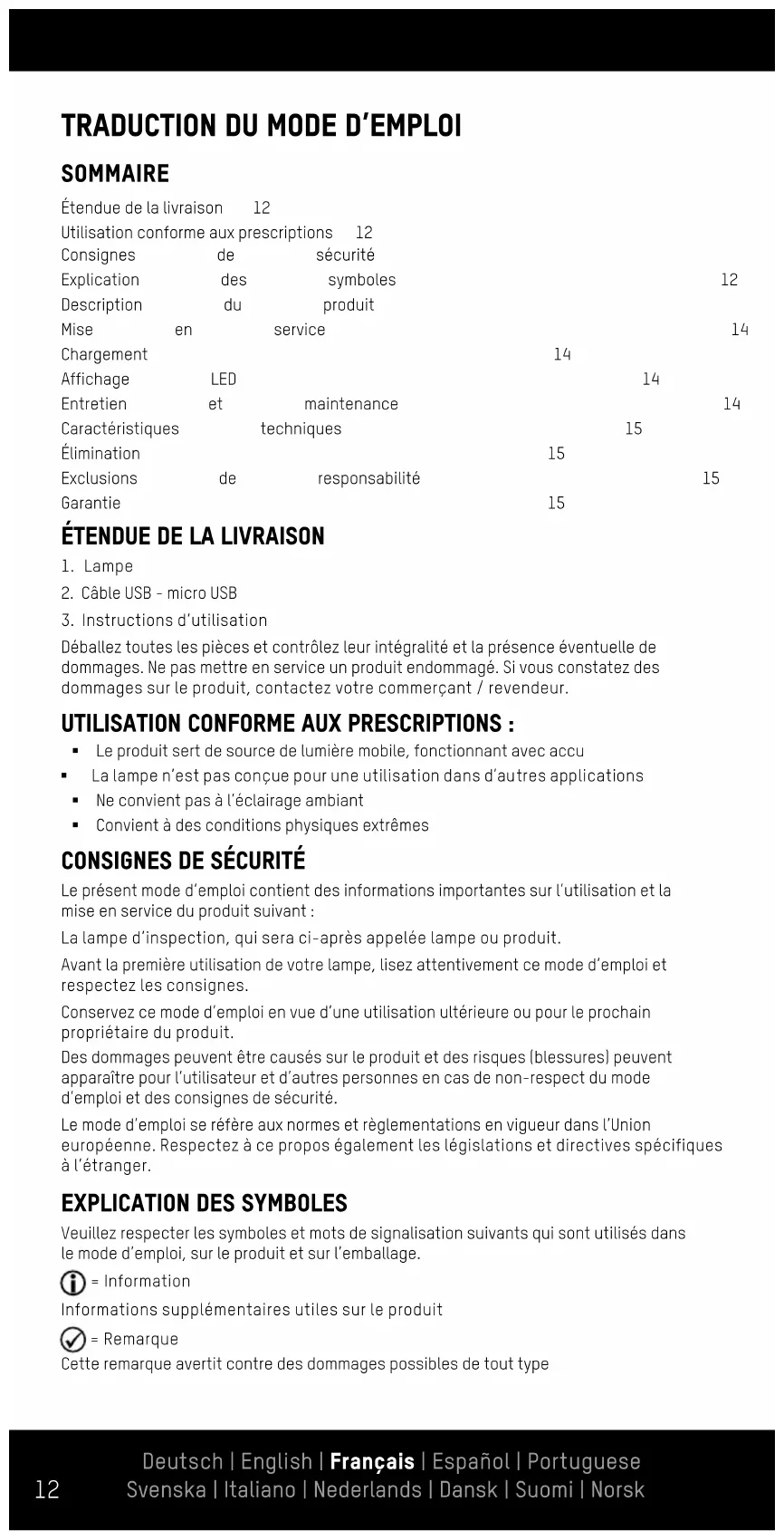 Veuillez respecter les symboles et mots de signalisation suivants qui sont utilisés dans le mode d’emploi, sur le produit et sur l’emballage. = Information Informations supplémentaires utiles sur le produit = Remarque Cette remarque avertit contre des dommages possibles de tout type Étendue de la livraison 12 Utilisation conforme aux prescriptions 12 Consignes de sécurité 12 Explication des symboles 12 Description du produit 14 Mise en service 14 Chargement 14 Affichage LED 14 Entretien et maintenance 14 Caractéristiques techniques 15 Élimination 15 Exclusions de responsabilité 15 Garantie 15 Deutsch | English | Français | Español | Portuguese Svenska | Italiano | Nederlands | Dansk | Suomi | Norsk Deutsch | English | Français | Español | Portuguese Svenska | Italiano | Nederlands | Dansk | Suomi | Norsk13 = Avertissement Attention – danger ! Peut entraîner des blessures graves, voire la mort RESPECTEZ LES CONSIGNES DE SÉCURITÉ ! Évitez les lésions oculaires – Ne regarder jamais directement dans le faisceau lumi- neux ou ne jamais éclairer des personnes dans le visage. Si cela se produit de manière prolongée, la part de lumière bleue peut causer un risque pour la rétine. Si un faisceau lumineux rencontre les yeux, fermez les yeux et tournez la tête pour éviter le faisceau lumineux. Cette lampe dépasse les conditions d‘une utilisation sans risque. Lors de l‘utilisation, le risque dépend de la manipulation de la lampe par l‘utilisateur. (1) Cette valeur indique le facteur par lequel la valeur seuil du groupe de risque passe au groupe inférieur suivant. La valeur seuil est de 1. (2) Distance des yeux à la lampe qui correspond au groupe de risque. Groupe de risque 2 Valeur risque de l‘exposition / Exposure Hazard Value (EHV)(1): 12 Groupe de risque Distance de danger / Hazard Distance (HD) (2) 2 0 m à 0,7 m 1 0,7 m à 7 m Groupe libre > 7 m § Les indications concernant la lampe, l’alimentation et la tension de réseau sur la prise doivent correspondre à la plaque signalétique. § En cas de dommages sur le boîtier, le connecteur, le câble ou le bloc d’alimenta- tion, ne pas mettre en marche le produit. Adressez-vous au magasin autorisé ou à l’adresse de service du fabricant. § Ne pas ouvrir ou modifier le produit ! Les travaux de réparation et le changement du bloc d‘accu ne doivent être effectués que par le fabricant ou par un technicien de service chargé de ce travail par le fabricant ou par une personne qualifiée de manière similaire. § Tenez les enfants éloignés du produit et de l‘emballage. Le produit n‘est pas un jouet. Les enfants devraient être surveillés afin de s‘assurer qu‘ils ne jouent pas avec le produit. § Ce produit n‘est pas conçu pour une utilisation par des personnes (y compris par des enfants) avec des capacités corporelles, sensorielles ou intellectuelles limitées ou avec une absence d‘expérience et de connaissances concernant la manipulation de ce produit. Ces personnes doivent être préalablement instruites par une personne de surveillance responsable de leur sécurité ou doivent être surveillées pendant l‘utilisation du produit ! § La source lumineuse à LED n’est pas remplaçable ; à la fin de la durée de vie de la LED, il faut remplacer la lampe complète § Tous les objets éclairés doivent être à une distance d‘au moins 10 cm de la lampe ! § La lampe doit uniquement être utilisée conformément aux prescriptions. § Le produit n’est pas un jouet. § Conserver le produit hors de portée des enfants ! § Le non-respect des consignes de sécurité peut causer des dommages sur l‘appareil ou entraîner des blessures graves ! § Veillez toujours à ce que le produit reste sec ATTENTION : § Le produit contient une batterie aux ions de lithium non remplaçable. Ne jetez pas le Deutsch | English | Français | Español | Portuguese Svenska | Italiano | Nederlands | Dansk | Suomi | Norsk14 produit au feu ! § Ne chargez le produit que dans des pièces fermées, au sec et vastes, à l’abri de matériaux et de liquides inflammables. Le non-respect peut entraîner des brûlures et des incendies. § Ne jamais ouvrir, écraser, chauffer ou enflammer une batterie. § Ne pas utiliser le produit dans un environnement à risque d’explosion et sous la pluie et ne pas l’exposer à une chaleur excessive. § Ne pas utiliser le produit s’il paraît endommagé DESCRIPTION DU PRODUIT :