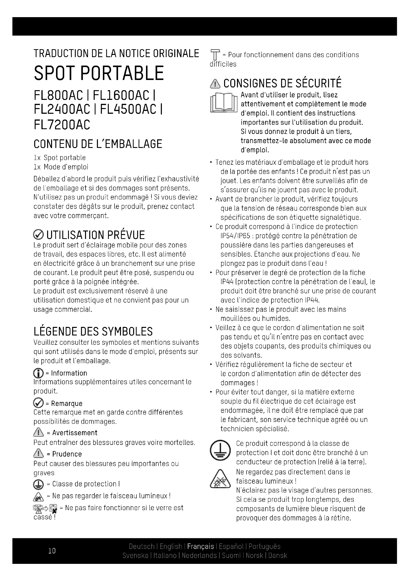 Avant d'utiliser le produit, lisez attentivement et complètement le mode d'emploi. Il contient des instructions importantes sur l'utilisation du produit.Si vous donnez le produit à un tiers, transmettez-le absolument avec ce mode d'emploi.• Tenez les matériaux d'emballage et le produit hors de la portée des enfants ! Ce produit n’est pas un jouet. Les enfants doivent être surveillés afin de s’assurer qu’ils ne jouent pas avec le produit.• Avant de brancher le produit, vérifiez toujours que la tension de réseau corresponde bien aux spécifications de son étiquette signalétique.• Ce produit correspond à l'indice de protection IP54/IP65 : protégé contre la pénétration de poussière dans les parties dangereuses et sensibles. Étanche aux projections d'eau. Ne plongez pas le produit dans l'eau !• Pour préserver le degré de protection de la fiche IP44 (protection contre la pénétration de l'eau), le produit doit être branché sur une prise de courant avec l'indice de protection IP44.• Ne saisissez pas le produit avec les mains mouillées ou humides.• Veillez à ce que le cordon d'alimentation ne soit pas tendu et qu’il n’entre pas en contact avec des objets coupants, des produits chimiques ou des solvants.• Vérifiez régulièrement la fiche de secteur et le cordon d'alimentation afin de détecter des dommages !• Pour éviter tout danger, si la matière externe souple du fil électrique de cet éclairage est endommagée, il ne doit être remplacé que par le fabricant, son service technique agréé ou un technicien spécialisé.Ce produit correspond à la classe de protection I et doit donc être branché à un conducteur de protection (relié à la terre).Ne regardez pas directement dans le faisceau lumineux ! N'éclairez pas le visage d'autres personnes. Si cela se produit trop longtemps, des composants de lumière bleue risquent de provoquer des dommages à la rétine.Deutsch | English | Français | Español | Português Svenska | Italiano | Nederlands | Suomi | Norsk | Dansk Deutsch | English | Français | Español | Português Svenska | Italiano | Nederlands | Suomi | Norsk | Dansk