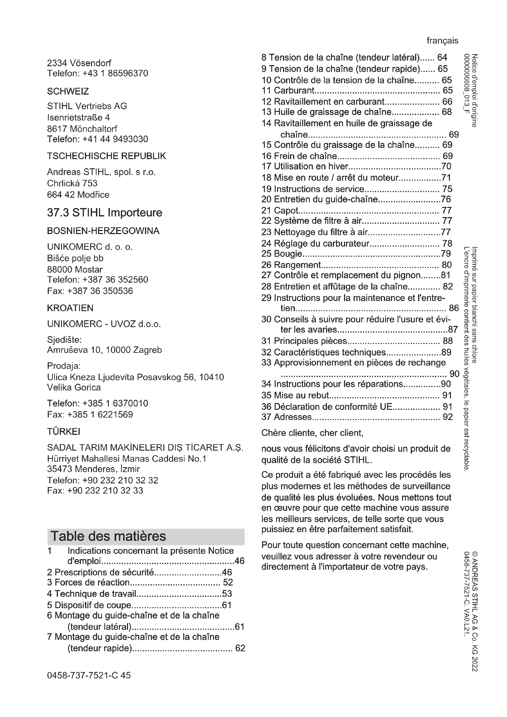 - 37 Adresses Chère cliente, cher client, nous vous félicitons d'avoir choisi un produit de qualité de la société STIHL. Ce produit a été fabriqué avec les procédés les plus modernes et les méthodes de surveillance de qualité les plus évoluées. Nous mettons tout en œuvre pour que cette machine vous assure les meilleurs services, de telle sorte que vous puissiez en être parfaitement satisfait. Pour toute question concernant cette machine, veuillez vous adresser à votre revendeur ou directement à l'importateur de votre pays. français 0458-737-7521-C 45 © ANDREAS STIHL AG & Co. KG 2022 0458-737-7521-C. VA0.L21. Imprimé sur papier blanchi sans chlore L'encre d'imprimerie contient des huiles végétales, le papier est recyclable. Notice d'emploi d'origine 0000006608_013_FDr. Nikolas Stihl 1 Indications concernant la présente Notice d'emploi La présente Notice d'emploi se rapporte à une tronçonneuse STIHL. Dans cette Notice d'em‐ ploi, la tronçonneuse est également appelée « machine ». p. 92