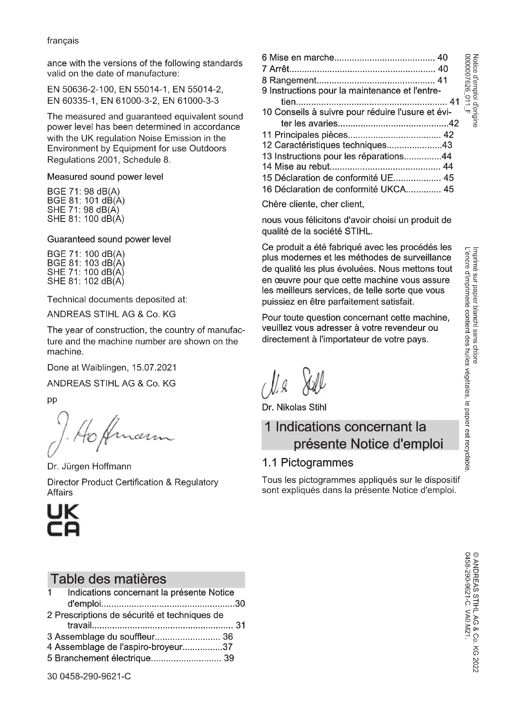 6 Mise en marche 40 7 Arrêt. 40 8 Rangement. 41 9 Instructions pour la maintenance et l'entretien. 41 10 Conseils à suivre pour réduire l'usure et éviter les avaries. 42 11 Principales pièces 42 12 Caractéristiques techniques. 43 13 Instructions pour les réparations. 44 14 Mise au rebut. 44 15 Déclaration de conformité UE. 45 16 Déclaration de conformité UKCA 45