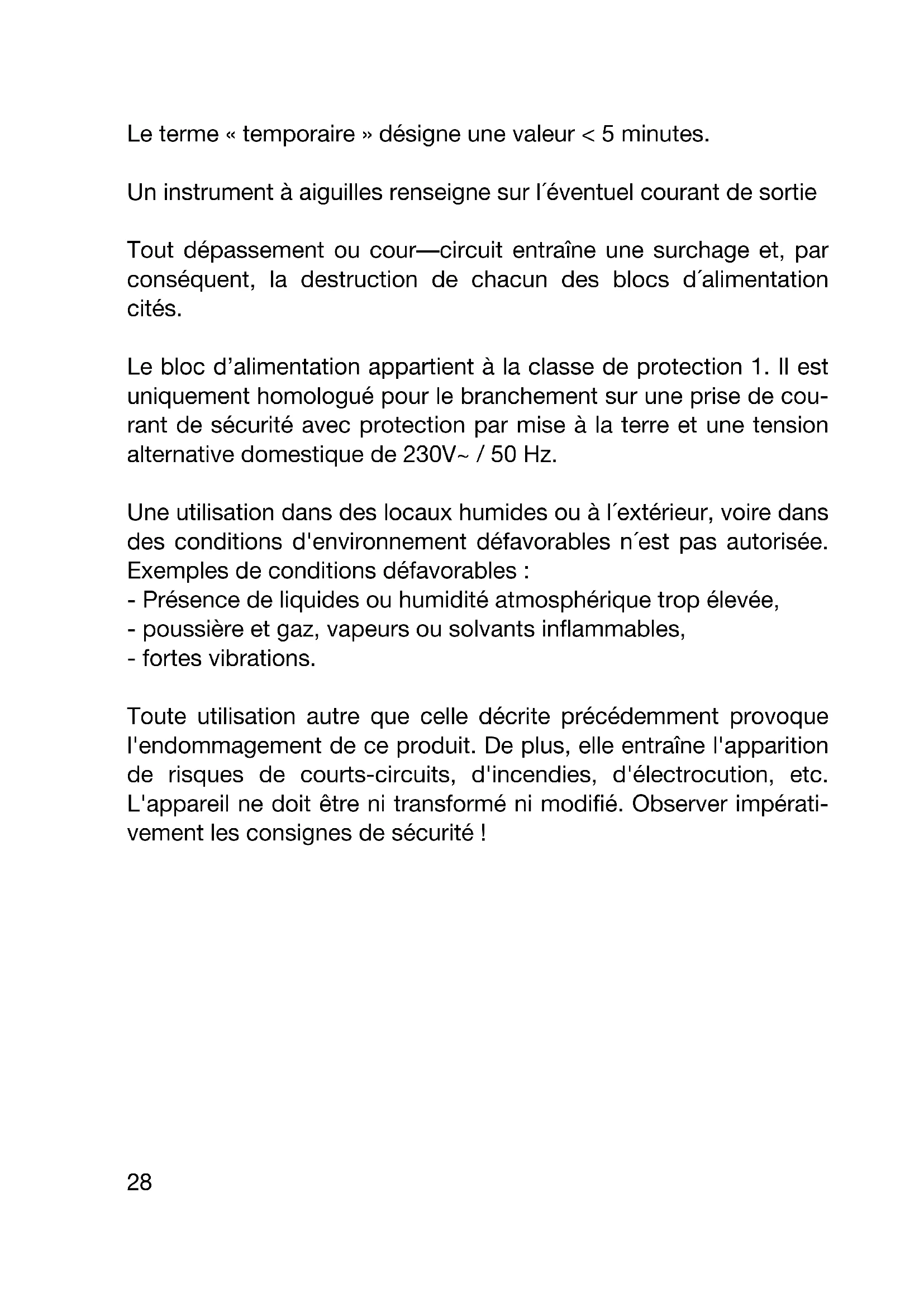 - Caractéristiques techniques Utilisation conforme Les blocs d´alimentation à tension fixe stabilisés sont conçus pour le branchement et le fonctionnement des consommateurs à faible tension. Observer les indications ci-dessous, selon l´appareil acquis : Modèle Tension de sortie – Courant de sortie max. FSP-1122 12 volts DC 2 A Service continu / temporaire 4A FSP-1243 24 volts DC 3 A Service continu / temporaire 5A FSP-1132 13,8 volts DC 2 A Service continu / temporaire 4A FSP-1134 13,8 volts DC 4 A Service continu / temporaire 6A FSP-1136 13,8 volts DC 6 A Service continu / temporaire 8A FSP-1138 13,8 volts DC 8 A Service continu / temporaire 10A FSP-11312 13,8 volts DC 12 A Service continu / temporaire 15A FSP-11320 13,8 volts DC 20 A Service continu / temporaire 22A FSP-11330 13,8 volts DC 30 A Service continu / temporaire 32A 27Le terme « temporaire » désigne une valeur < 5 minutes. Un instrument à aiguilles renseigne sur l´éventuel courant de sortie Tout dépassement ou cour—circuit entraîne une surchage et, par conséquent, la destruction de chacun des blocs d´alimentation cités. Le bloc d’alimentation appartient à la classe de protection 1. Il est uniquement homologué pour le branchement sur une prise de cou- rant de sécurité avec protection par mise à la terre et une tension alternative domestique de 230V~ / 50 Hz. Une utilisation dans des locaux humides ou à l´extérieur, voire dans des conditions d'environnement défavorables n´est pas autorisée. Exemples de conditions défavorables : - Présence de liquides ou humidité atmosphérique trop élevée, - poussière et gaz, vapeurs ou solvants inflammables, - fortes vibrations. Toute utilisation autre que celle décrite précédemment provoque l'endommagement de ce produit. De plus, elle entraîne l'apparition de risques de courts-circuits, d'incendies, d'électrocution, etc. L'appareil ne doit être ni transformé ni modifié. Observer impérati- vement les consignes de sécurité ! 28Consignes de sécurité et indications de danger Tout dommage résultant d’un non-respect des pré- sentes instructions a pour effet d’annuler la garantie ! De même, nous n’assumons aucune responsabilité en cas de dommages matériels ou corporels résul- tant d’une utilisation de l’appareil non conforme aux spécifications ou d’un non-respect des présentes instructions ! Du point de vue de la sécurité, cet appareil a quitté l’usine en parfait état. Pour maintenir le produit dans cet état et pour assurer un fonction- nement sans risques, l'utilisateur est tenu d’observer les consignes de sécurité et les avertissements figurant dans le présent mode d'emploi. Observez les pictogrammes suivants: Nota : Lire le mode d'emploi ! Cet appareil est agréé CE et satisfait ainsi aux direc- tives relatives à la compatibilité électromagnétique 89/336/CEE et aux appareils basse tension 73/23/CEE. Transformateur de séparation de sécurité p. 36
