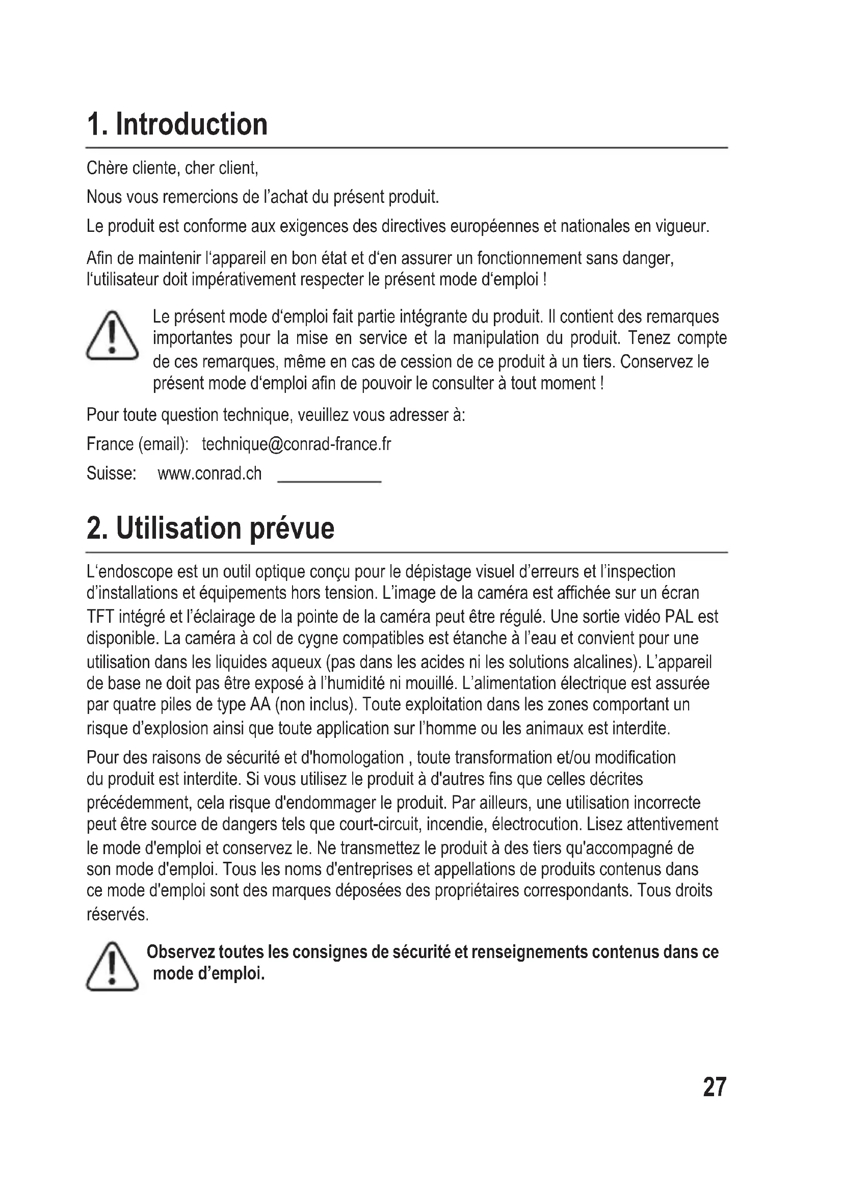 Chèrecliente,cherclient, Nous vous remercions de l’achat du présent produit. Le produit est conforme aux exigences des directives européennes et nationales en vigueur. Andemaintenirl‘appareilenbonétatetd‘enassurerunfonctionnementsansdanger, l‘utilisateurdoitimpérativementrespecterleprésentmoded‘emploi! Leprésentmoded‘emploifaitpartieintégranteduproduit.Ilcontientdesremarques importantes pour la mise en service et la manipulation du produit. Tenez compte decesremarques,mêmeencasdecessiondeceproduitàuntiers.Conservezle présentmoded‘emploiandepouvoirleconsulteràtoutmoment! Pourtoutequestiontechnique,veuillezvousadresserà: France (email): technique@conrad-france.fr Suisse: www.conrad.ch