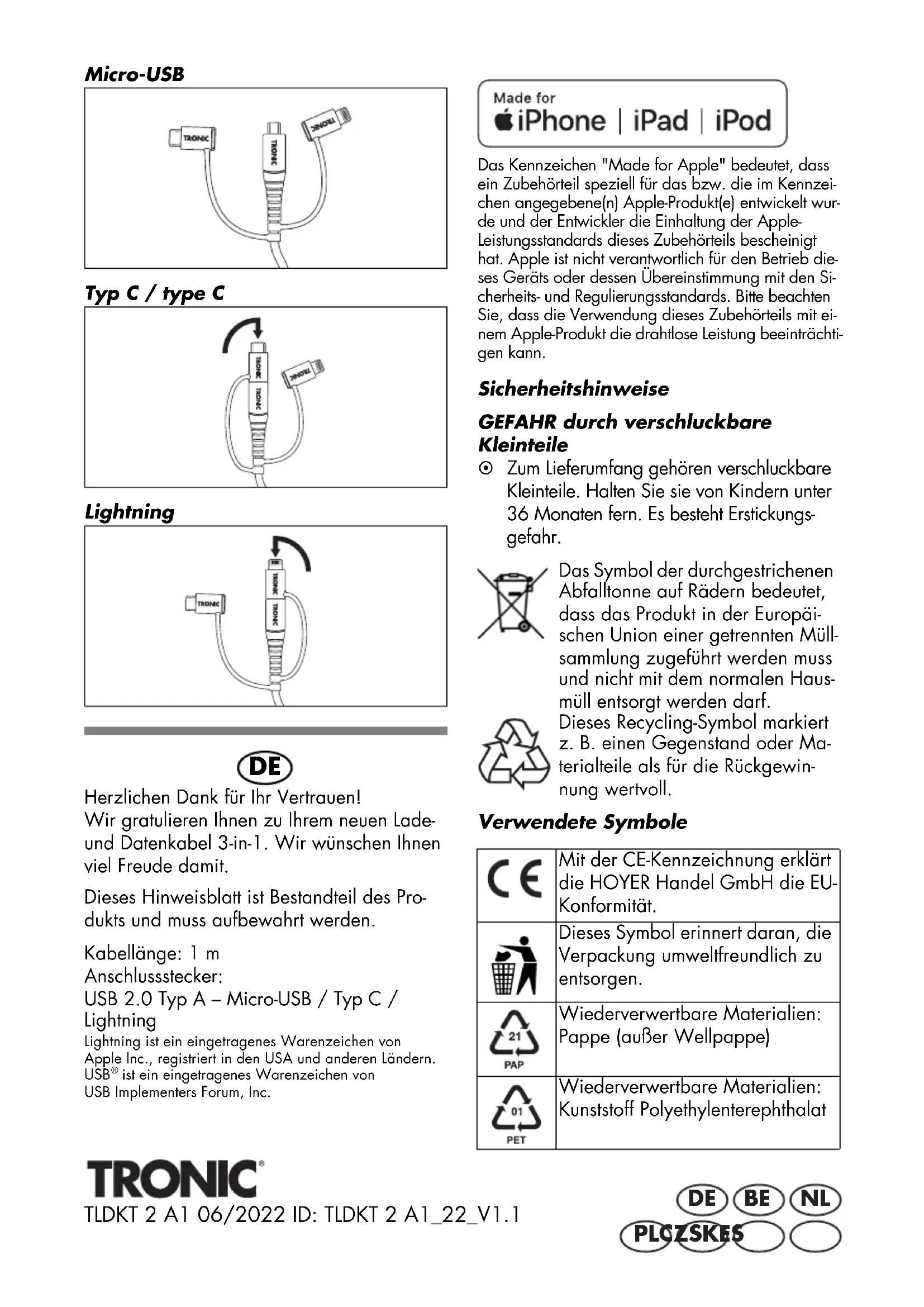 Lieferant / Supplier HOYER Handel GmbH / Kühnehöfe 12 / 22761 Hamburg DEUTSCHLAND / GERMANY 392847_2201_3in1_B8__B.fm Seite 3 onnet, 2. Juni 2022 2:07 14Micro-USB USB de type C / type C Lightning Nous vous remercions pour votre confiance ! Nous vous félicitons pour l'achat de votre nouveau câble de recharge et synchronisa- tion 3 en 1. Nous espérons qu'il vous appor- tera entière satisfaction. Cette fiche d'information fait partie inté- grante du produit et doit être conservée. Longueur du câble : 1 m Connecteur : USB 2.0 de type A – micro-USB / USB de type C / Lightning Lightning est une marque déposée d'Apple Inc., enregis-trée aux États-Unis et dans d'autres pays. USB