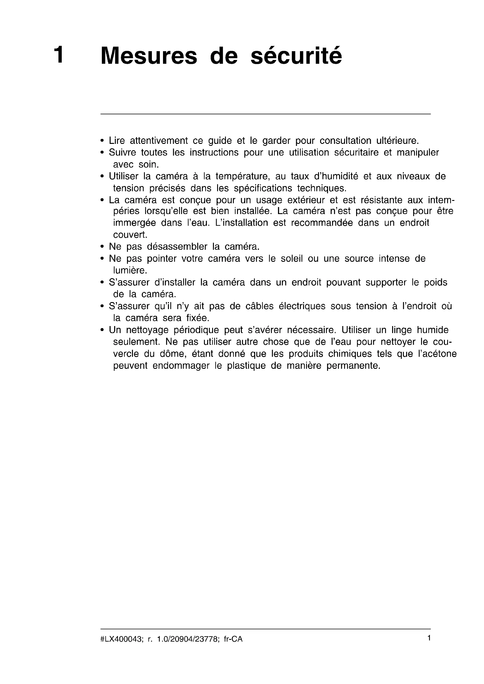 - La caméra est conçue pour un usage extérieur et est résistante aux intem- péries lorsqu’elle est bien installée. La caméra n’est pas conçue pour être immergée dans l’eau. L’installation est recommandée dans un endroit couvert.