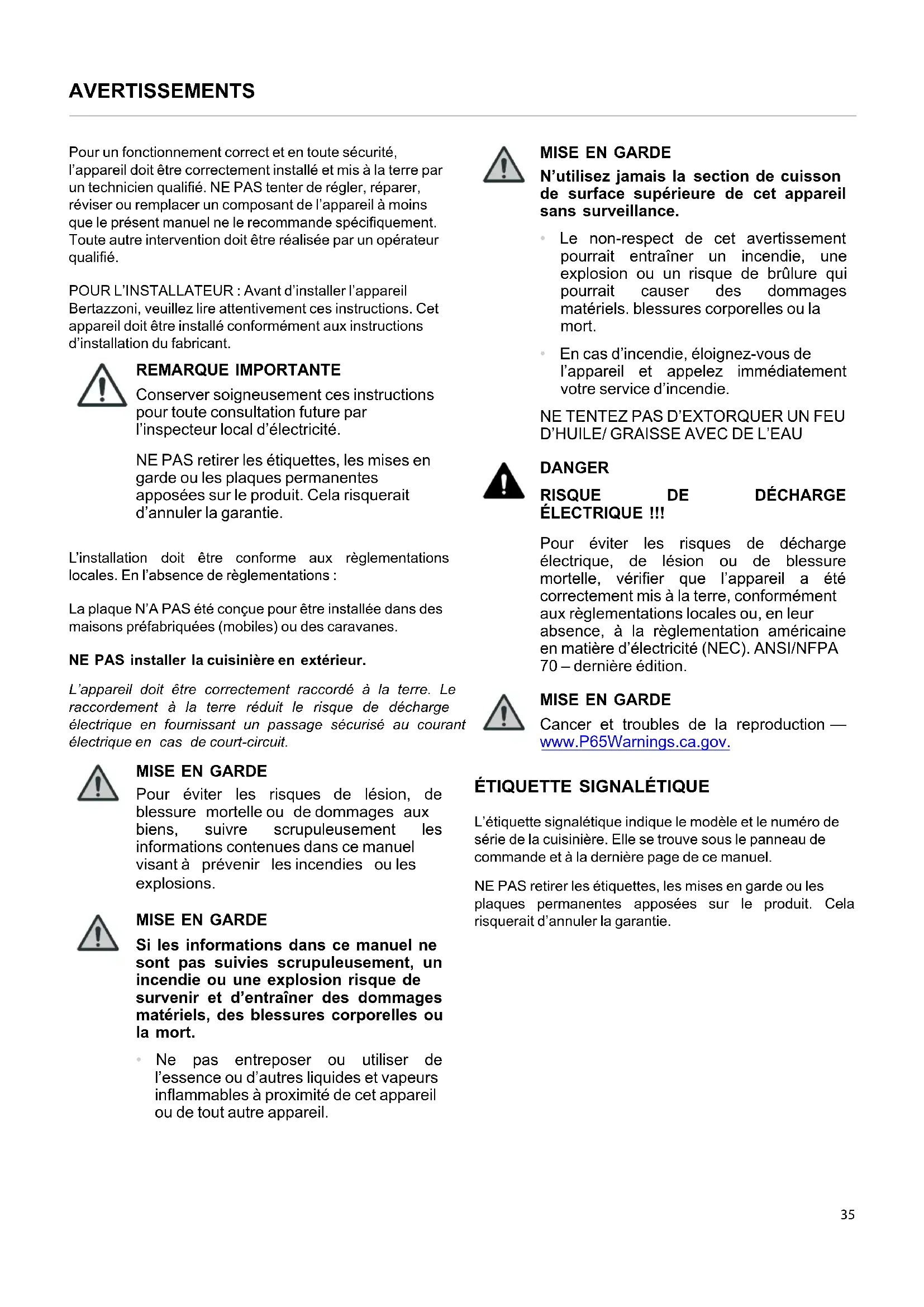 - AVERTISSEMENTS p. 35