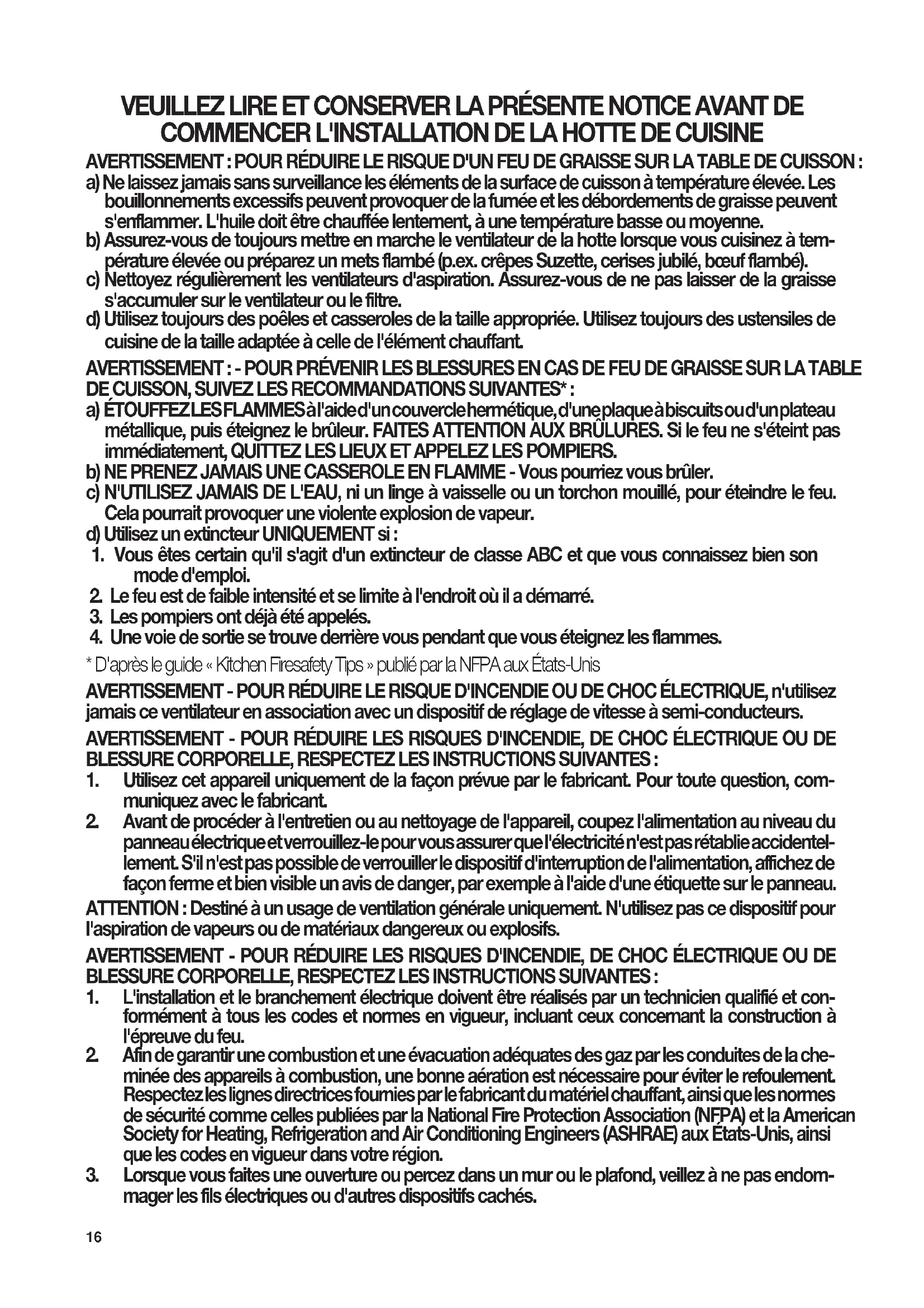 - D'après le guide «Kitchen Firesafety Tips» publié par la NFPA aux États-Unis AVERTISSEMENT - POUR RÉDUIRE LE RISQUE D'INCENDIE OU DE CHOC ÉLECTRIQUE, n'utilisez jamais ce ventilateur en association avec un dispositif de réglage de vitesse à semi-conducteurs. AVERTISSEMENT - POUR RÉDUIRE LES RISQUES D'INCENDIE, DE CHOC ÉLECTRIQUE OU DE BLESSURECORPORELLE,RESPECTEZLESINSTRUCTIONSSUIVANTES: