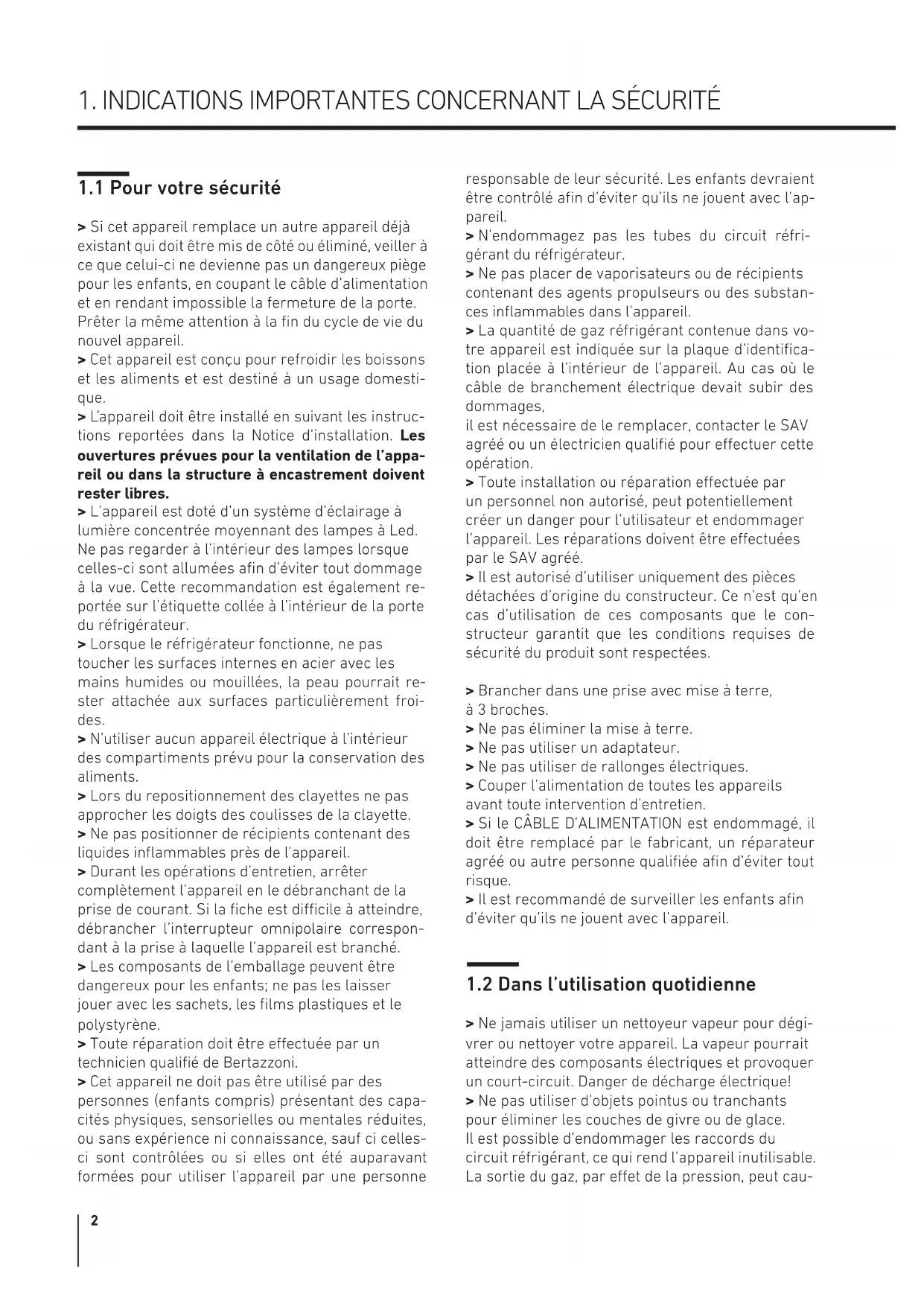 > Si cet appareil remplace un autre appareil déjà existant qui doit être mis de côté ou éliminé, veiller à ce que celui-ci ne devienne pas un dangereux piège pour les enfants, en coupant le câble d’alimentation et en rendant impossible la fermeture de la porte. Prêter la même attention à la fin du cycle de vie du nouvel appareil. > Cet appareil est conçu pour refroidir les boissons et les aliments et est destiné à un usage domesti- que. > L’appareil doit être installé en suivant les instruc- tions reportées dans la Notice d’installation. Les ouvertures prévues pour la ventilation de l’appa- reil ou dans la structure à encastrement doivent rester libres. > L’appareil est doté d’un système d’éclairage à lumière concentrée moyennant des lampes à Led. Ne pas regarder à l’intérieur des lampes lorsque celles-ci sont allumées afin d’éviter tout dommage à la vue. Cette recommandation est également re- portée sur l’étiquette collée à l’intérieur de la porte du réfrigérateur. > Lorsque le réfrigérateur fonctionne, ne pas toucher les surfaces internes en acier avec les mains humides ou mouillées, la peau pourrait re- ster attachée aux surfaces particulièrement froi- des. > N’utiliser aucun appareil électrique à l’intérieur des compartiments prévu pour la conservation des aliments. > Lors du repositionnement des clayettes ne pas approcher les doigts des coulisses de la clayette. > Ne pas positionner de récipients contenant des liquides inflammables près de l’appareil. > Durant les opérations d’entretien, arrêter complètement l’appareil en le débranchant de la prise de courant. Si la fiche est dicile à atteindre, débrancher l’interrupteur omnipolaire correspon- dant à la prise à laquelle l’appareil est branché. > Les composants de l’emballage peuvent être dangereux pour les enfants; ne pas les laisser jouer avec les sachets, les films plastiques et le polystyrène. > Toute réparation doit être eectuée par un technicien qualifié de Bertazzoni. > Cet appareil ne doit pas être utilisé par des personnes (enfants compris) présentant des capa- cités physiques, sensorielles ou mentales réduites, ou sans expérience ni connaissance, sauf ci celles- ci sont contrôlées ou si elles ont été auparavant formées pour utiliser l’appareil par une personne responsable de leur sécurité. Les enfants devraient être contrôlé afin d’éviter qu’ils ne jouent avec l’ap- pareil. > N’endommagez pas les tubes du circuit réfri- gérant du réfrigérateur. > Ne pas placer de vaporisateurs ou de récipients contenant des agents propulseurs ou des substan- ces inflammables dans l’appareil. > La quantité de gaz réfrigérant contenue dans vo- tre appareil est indiquée sur la plaque d’identifica- tion placée à l’intérieur de l’appareil. Au cas où le câble de branchement électrique devait subir des dommages, il est nécessaire de le remplacer, contacter le SAV agréé ou un électricien qualifié pour eectuer cette opération. > Toute installation ou réparation eectuée par un personnel non autorisé, peut potentiellement créer un danger pour l’utilisateur et endommager l’appareil. Les réparations doivent être eectuées par le SAV agréé. > Il est autorisé d’utiliser uniquement des pièces détachées d’origine du constructeur. Ce n’est qu’en cas d’utilisation de ces composants que le con- structeur garantit que les conditions requises de sécurité du produit sont respectées. > Brancher dans une prise avec mise à terre, à 3 broches. > Ne pas éliminer la mise à terre. > Ne pas utiliser un adaptateur. > Ne pas utiliser de rallonges électriques. > Couper l’alimentation de toutes les appareils avant toute intervention d’entretien. > Si le CÂBLE D’ALIMENTATION est endommagé, il doit être remplacé par le fabricant, un réparateur agréé ou autre personne qualifiée afin d’éviter tout risque. > Il est recommandé de surveiller les enfants afin d’éviter qu’ils ne jouent avec l’appareil.