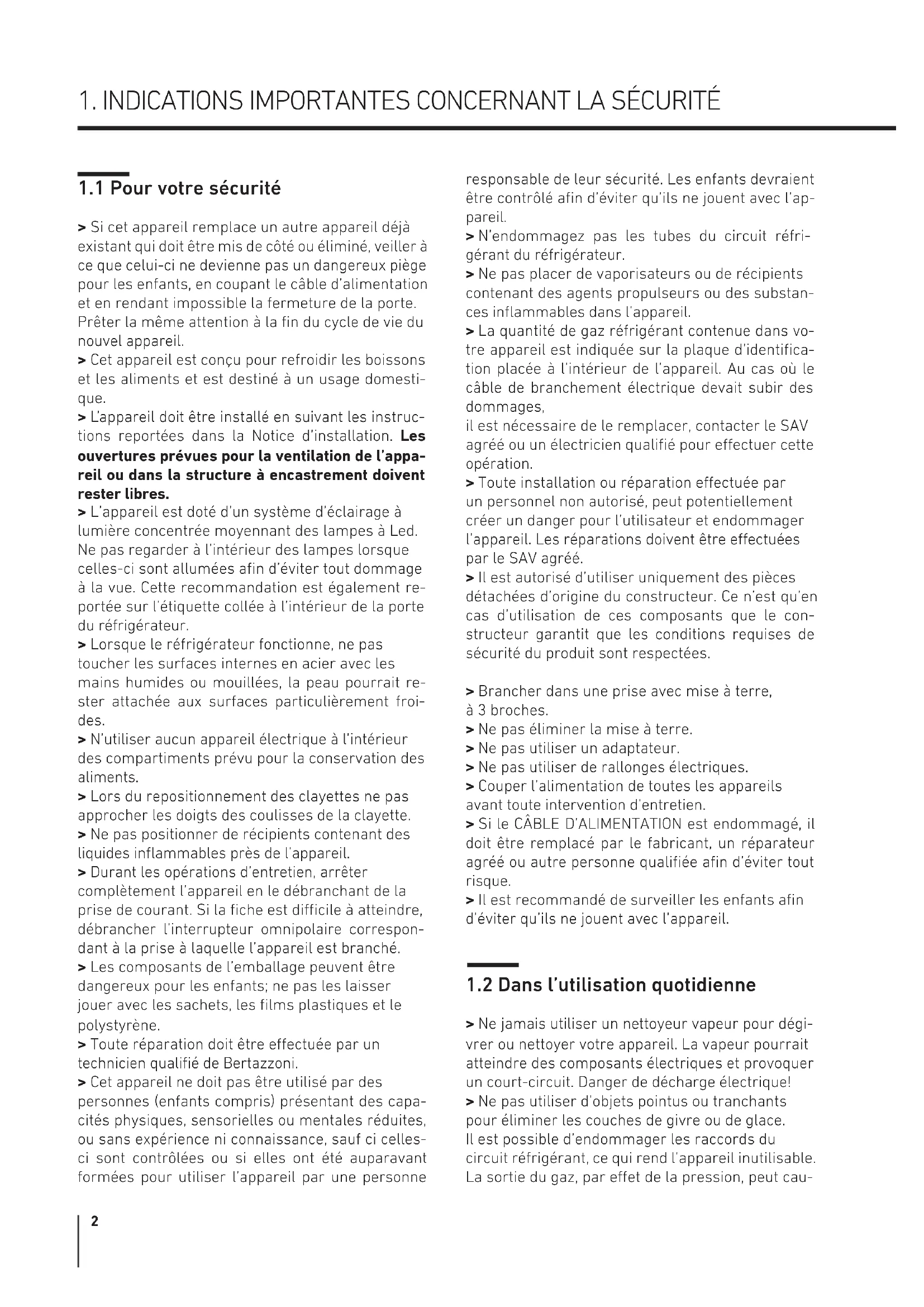 > Si cet appareil remplace un autre appareil déjà existant qui doit être mis de côté ou éliminé, veiller à ce que celui-ci ne devienne pas un dangereux piège pour les enfants, en coupant le câble d’alimentation et en rendant impossible la fermeture de la porte. Prêter la même attention à la fin du cycle de vie du nouvel appareil. > Cet appareil est conçu pour refroidir les boissons et les aliments et est destiné à un usage domesti- que. > L’appareil doit être installé en suivant les instruc- tions reportées dans la Notice d’installation. Les ouvertures prévues pour la ventilation de l’appa- reil ou dans la structure à encastrement doivent rester libres. > L’appareil est doté d’un système d’éclairage à lumière concentrée moyennant des lampes à Led. Ne pas regarder à l’intérieur des lampes lorsque celles-ci sont allumées afin d’éviter tout dommage à la vue. Cette recommandation est également re- portée sur l’étiquette collée à l’intérieur de la porte du réfrigérateur. > Lorsque le réfrigérateur fonctionne, ne pas toucher les surfaces internes en acier avec les mains humides ou mouillées, la peau pourrait re- ster attachée aux surfaces particulièrement froi- des. > N’utiliser aucun appareil électrique à l’intérieur des compartiments prévu pour la conservation des aliments. > Lors du repositionnement des clayettes ne pas approcher les doigts des coulisses de la clayette. > Ne pas positionner de récipients contenant des liquides inflammables près de l’appareil. > Durant les opérations d’entretien, arrêter complètement l’appareil en le débranchant de la prise de courant. Si la fiche est dicile à atteindre, débrancher l’interrupteur omnipolaire correspon- dant à la prise à laquelle l’appareil est branché. > Les composants de l’emballage peuvent être dangereux pour les enfants; ne pas les laisser jouer avec les sachets, les films plastiques et le polystyrène. > Toute réparation doit être eectuée par un technicien qualifié de Bertazzoni. > Cet appareil ne doit pas être utilisé par des personnes (enfants compris) présentant des capa- cités physiques, sensorielles ou mentales réduites, ou sans expérience ni connaissance, sauf ci celles- ci sont contrôlées ou si elles ont été auparavant formées pour utiliser l’appareil par une personne responsable de leur sécurité. Les enfants devraient être contrôlé afin d’éviter qu’ils ne jouent avec l’ap- pareil. > N’endommagez pas les tubes du circuit réfri- gérant du réfrigérateur. > Ne pas placer de vaporisateurs ou de récipients contenant des agents propulseurs ou des substan- ces inflammables dans l’appareil. > La quantité de gaz réfrigérant contenue dans vo- tre appareil est indiquée sur la plaque d’identifica- tion placée à l’intérieur de l’appareil. Au cas où le câble de branchement électrique devait subir des dommages, il est nécessaire de le remplacer, contacter le SAV agréé ou un électricien qualifié pour eectuer cette opération. > Toute installation ou réparation eectuée par un personnel non autorisé, peut potentiellement créer un danger pour l’utilisateur et endommager l’appareil. Les réparations doivent être eectuées par le SAV agréé. > Il est autorisé d’utiliser uniquement des pièces détachées d’origine du constructeur. Ce n’est qu’en cas d’utilisation de ces composants que le con- structeur garantit que les conditions requises de sécurité du produit sont respectées. > Brancher dans une prise avec mise à terre, à 3 broches. > Ne pas éliminer la mise à terre. > Ne pas utiliser un adaptateur. > Ne pas utiliser de rallonges électriques. > Couper l’alimentation de toutes les appareils avant toute intervention d’entretien. > Si le CÂBLE D’ALIMENTATION est endommagé, il doit être remplacé par le fabricant, un réparateur agréé ou autre personne qualifiée afin d’éviter tout risque. > Il est recommandé de surveiller les enfants afin d’éviter qu’ils ne jouent avec l’appareil.