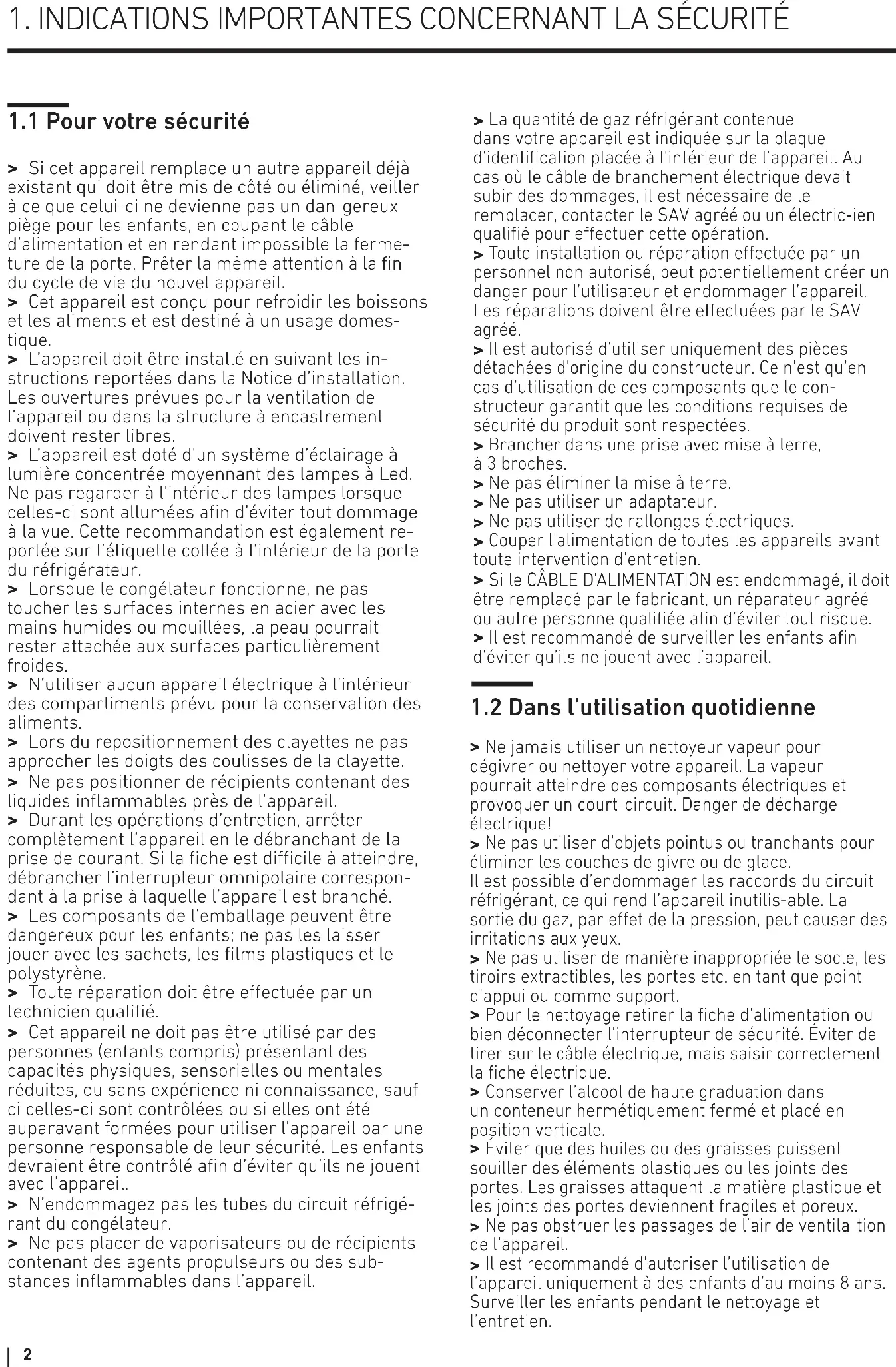 > Si cet appareil remplace un autre appareil déjà existant qui doit être mis de côté ou éliminé, veiller à ce que celui-ci ne devienne pas un dan-gereux piège pour les enfants, en coupant le câble d’alimentation et en rendant impossible la ferme- ture de la porte. Prêter la même attention à la fin du cycle de vie du nouvel appareil. > Cet appareil est conçu pour refroidir les boissons et les aliments et est destiné à un usage domes- tique. > L’appareil doit être installé en suivant les in- structions reportées dans la Notice d’installation. Les ouvertures prévues pour la ventilation de l’appareil ou dans la structure à encastrement doivent rester libres. > L’appareil est doté d’un système d’éclairage à lumière concentrée moyennant des lampes à Led. Ne pas regarder à l’intérieur des lampes lorsque celles-ci sont allumées afin d’éviter tout dommage à la vue. Cette recommandation est également re- portée sur l’étiquette collée à l’intérieur de la porte du réfrigérateur. > Lorsque le congélateur fonctionne, ne pas toucher les surfaces internes en acier avec les mains humides ou mouillées, la peau pourrait rester attachée aux surfaces particulièrement froides. > N’utiliser aucun appareil électrique à l’intérieur des compartiments prévu pour la conservation des aliments. > Lors du repositionnement des clayettes ne pas approcher les doigts des coulisses de la clayette. > Ne pas positionner de récipients contenant des liquides inflammables près de l’appareil. > Durant les opérations d’entretien, arrêter complètement l’appareil en le débranchant de la prise de courant. Si la fiche est difficile à atteindre, débrancher l’interrupteur omnipolaire correspon- dant à la prise à laquelle l’appareil est branché. > Les composants de l’emballage peuvent être dangereux pour les enfants; ne pas les laisser jouer avec les sachets, les films plastiques et le polystyrène. > Toute réparation doit être effectuée par un technicien qualifié. > Cet appareil ne doit pas être utilisé par des personnes (enfants compris) présentant des capacités physiques, sensorielles ou mentales réduites, ou sans expérience ni connaissance, sauf ci celles-ci sont contrôlées ou si elles ont été auparavant formées pour utiliser l’appareil par une personne responsable de leur sécurité. Les enfants devraient être contrôlé afin d’éviter qu’ils ne jouent avec l’appareil. > N’endommagez pas les tubes du circuit réfrigé- rant du congélateur. > Ne pas placer de vaporisateurs ou de récipients contenant des agents propulseurs ou des sub- stances inflammables dans l’appareil.