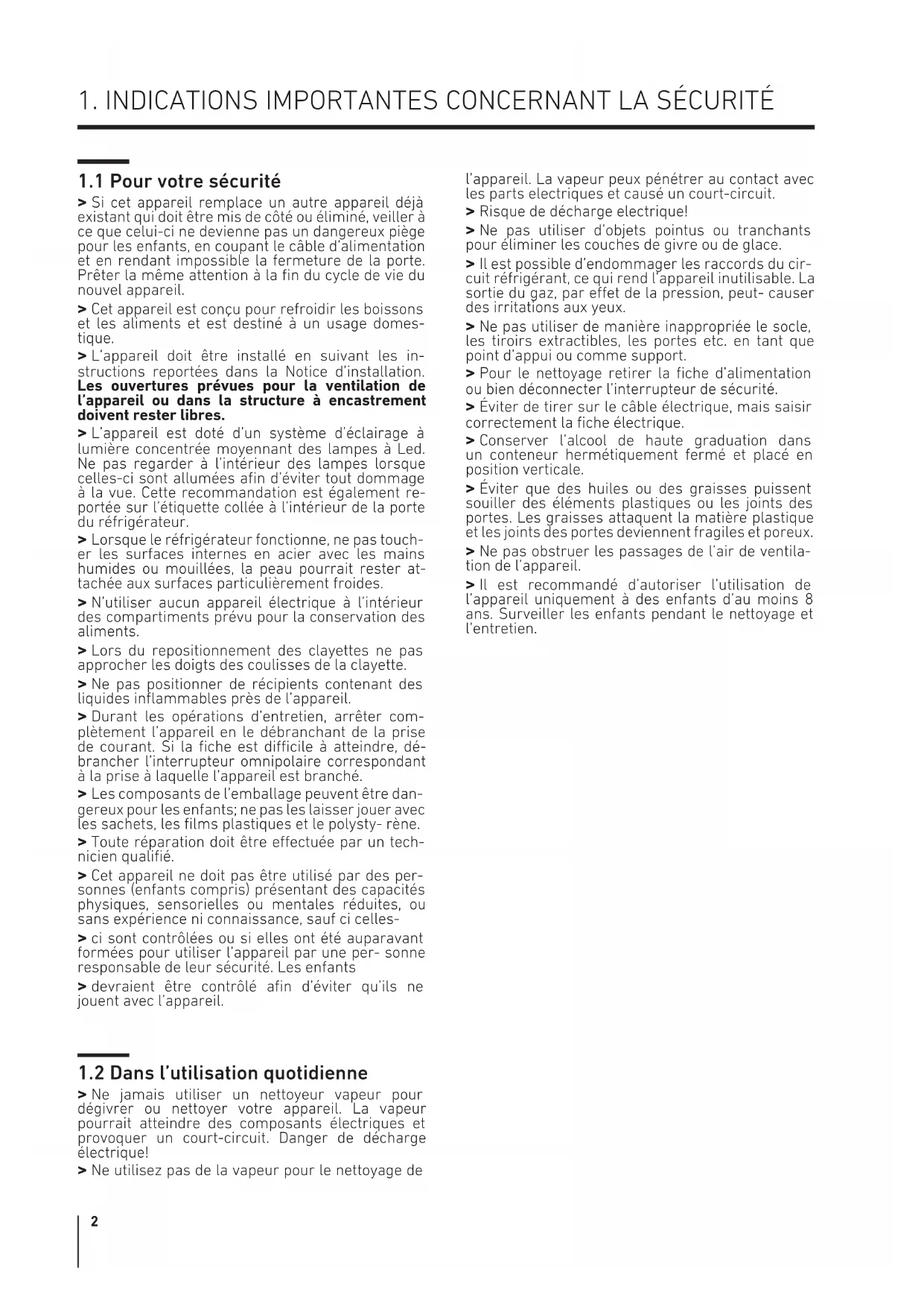 > Si cet appareil remplace un autre appareil déjà existant qui doit être mis de côté ou éliminé, veiller à ce que celui-ci ne devienne pas un dangereux piège pour les enfants, en coupant le câble d’alimentation et en rendant impossible la fermeture de la porte. Prêter la même attention à la fin du cycle de vie du nouvel appareil. > Cet appareil est conçu pour refroidir les boissons et les aliments et est destiné à un usage domes- tique. > L’appareil doit être installé en suivant les in- structions reportées dans la Notice d’installation. Les ouvertures prévues pour la ventilation de l’appareil ou dans la structure à encastrement doivent rester libres. > L’appareil est doté d’un système d’éclairage à lumière concentrée moyennant des lampes à Led. Ne pas regarder à l’intérieur des lampes lorsque celles-ci sont allumées afin d’éviter tout dommage à la vue. Cette recommandation est également re- portée sur l’étiquette collée à l’intérieur de la porte du réfrigérateur. > Lorsque le réfrigérateur fonctionne, ne pas touch- er les surfaces internes en acier avec les mains humides ou mouillées, la peau pourrait rester at- tachée aux surfaces particulièrement froides. > N’utiliser aucun appareil électrique à l’intérieur des compartiments prévu pour la conservation des aliments. > Lors du repositionnement des clayettes ne pas approcher les doigts des coulisses de la clayette. > Ne pas positionner de récipients contenant des liquides inflammables près de l’appareil. > Durant les opérations d’entretien, arrêter com- plètement l’appareil en le débranchant de la prise de courant. Si la fiche est dicile à atteindre, dé- brancher l’interrupteur omnipolaire correspondant à la prise à laquelle l’appareil est branché. > Les composants de l’emballage peuvent être dan- gereux pour les enfants; ne pas les laisser jouer avec les sachets, les films plastiques et le polysty- rène. > Toute réparation doit être eectuée par un tech- nicien qualifié. > Cet appareil ne doit pas être utilisé par des per- sonnes (enfants compris) présentant des capacités physiques, sensorielles ou mentales réduites, ou sans expérience ni connaissance, sauf ci celles- > ci sont contrôlées ou si elles ont été auparavant formées pour utiliser l’appareil par une per- sonne responsable de leur sécurité. Les enfants > devraient être contrôlé afin d’éviter qu’ils ne jouent avec l’appareil.