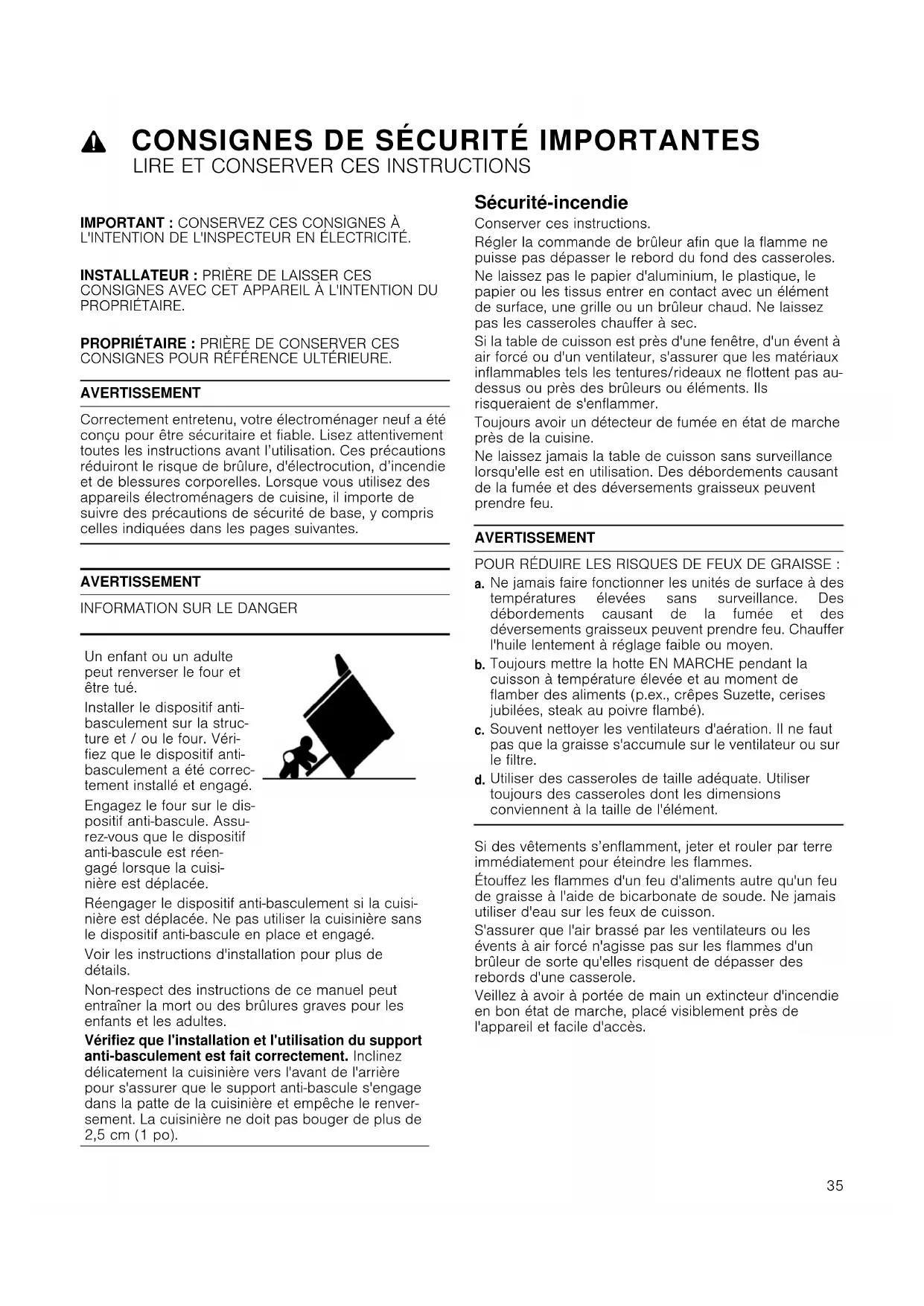 Utiliser des casseroles de taille adéquate. Utiliser toujours des casseroles dont les dimensions conviennent à la taille de l'élément. Si des vêtements s’enflamment, jeter et rouler par terre immédiatement pour éteindre les flammes. Étouffez les flammes d'un feu d'aliments autre qu'un feu de graisse à l'aide de bicarbonate de soude. Ne jamais utiliser d'eau sur les feux de cuisson. S'assurer que l'air brassé par les ventilateurs ou les évents à air forcé n'agisse pas sur les flammes d'un brûleur de sorte qu'elles risquent de dépasser des rebords d'une casserole. Veillez à avoir à portée de main un extincteur d'incendie en bon état de marche, placé visiblement près de l'appareil et facile d'accès. Un enfant ou un adulte peut renverser le four et être tué. Installer le dispositif anti- basculement sur la struc- ture et / ou le four. Véri- fiez que le dispositif anti- basculement a été correc- tement installé et engagé. Engagez le four sur le dis- positif anti-bascule. Assu- rez-vous que le dispositif anti-bascule est réen- gagé lorsque la cuisi- nière est déplacée. Réengager le dispositif anti-basculement si la cuisi- nière est déplacée. Ne pas utiliser la cuisinière sans le dispositif anti-bascule en place et engagé. Voir les instructions d'installation pour plus de détails. Non-respect des instructions de ce manuel peut entraîner la mort ou des brûlures graves pour les enfants et les adultes. Vérifiez que l'installation et l'utilisation du support anti-basculement est fait correctement. Inclinez délicatement la cuisinière vers l'avant de l'arrière pour s'assurer que le support anti-bascule s'engage dans la patte de la cuisinière et empêche le renver- sement. La cuisinière ne doit pas bouger de plus de 2,5 cm (1 po).9 CONSIGNES DE SÉCURITÉ IMPORTANTES