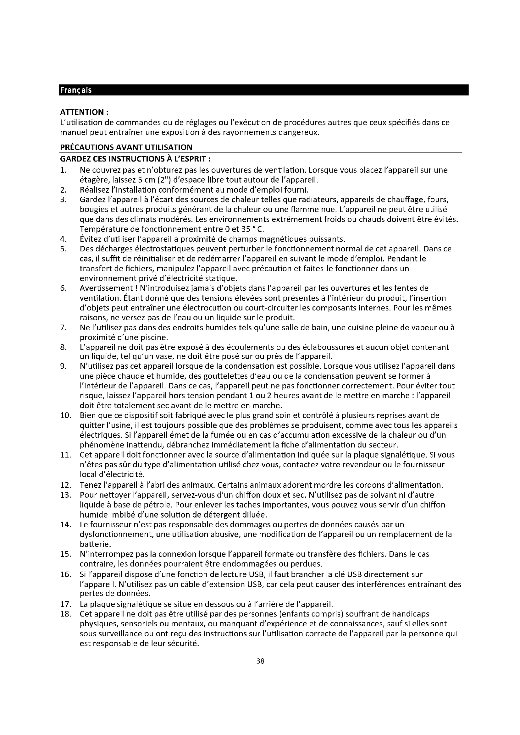 21. N’ouvrez jamais cet appareil.