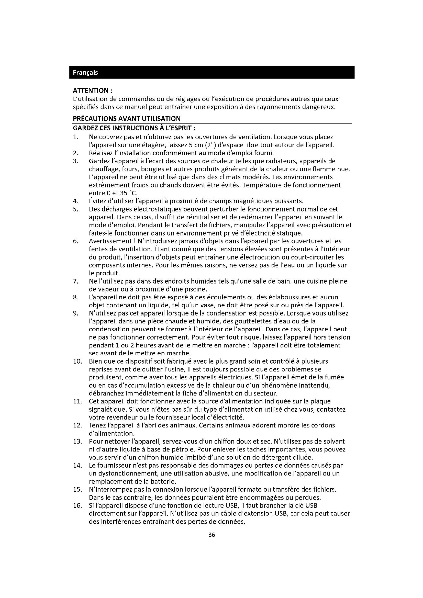 9. N’utilisez pas cet appareil lorsque de la condensation est possible. Lorsque vous utilisez