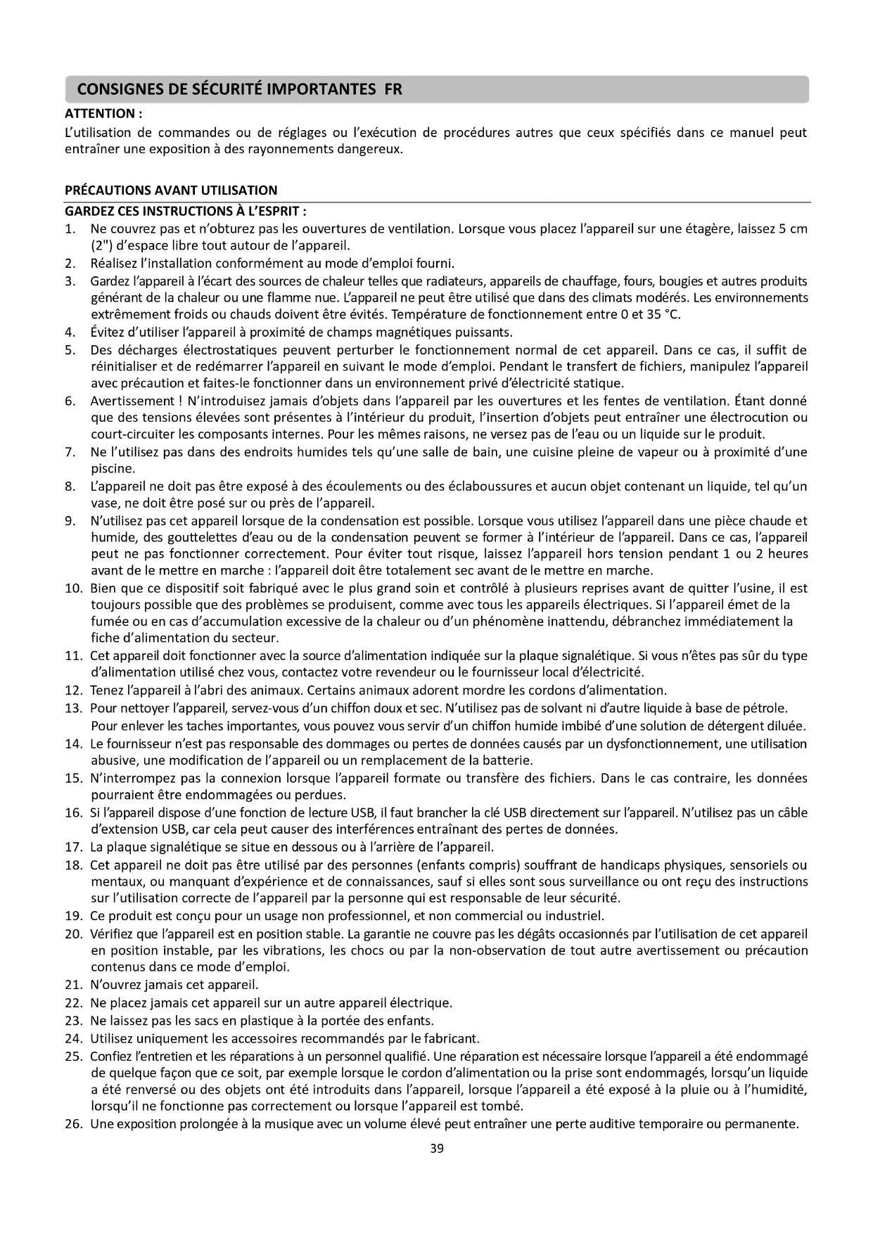 réinitialiser et de redémarrer l’appareil en suivant le mode d’emploi. Pendant le transfert de fichiers, manipulez l’appareil avec précaution et faites-le fonctionner dans un environnement privé d’électricité statique. 6. Avertissement ! N’introduisez jamais d’objets dans l’appareil par les ouvertures et les fentes de ventilation. Étant donné que des tensions élevées sont présentes à l’intérieur du produit, l’insertion d’objets peut entraîner une électrocution ou court-circuiter les composants internes. Pour les mêmes raisons, ne versez pas de l’eau ou un liquide sur le produit. 7. Ne l’utilisez pas dans des endroits humides tels qu’une salle de bain, une cuisine pleine de vapeur ou à proximité d’une piscine. 8. L’appareil ne doit pas être exposé à des écoulements ou des éclaboussures et aucun objet contenant un liquide, tel qu’un vase, ne doit être posé sur ou près de l’appareil. 9. N’utilisez pas cet appareil lorsque de la condensation est possible. Lorsque vous utilisez l’appareil dans une pièce chaude et humide, des gouttelettes d’eau ou de la condensation peuvent se former à l’intérieur de l’appareil. Dans ce cas, l’appareil peut ne pas fonctionner correctement. Pour éviter tout risque, laissez l’appareil hors tension pendant 1 ou 2 heures avant de le mettre en marche : l’appareil doit être totalement sec avant de le mettre en marche. 10. Bien que ce dispositif soit fabriqué avec le plus grand soin et contrôlé à plusieurs reprises avant de quitter l’usine, il est toujours possible que des problèmes se produisent, comme avec tous les appareils électriques. Si l’appareil émet de la fumée ou en cas d’accumulation excessive de la chaleur ou d’un phénomène inattendu, débranchez immédiatement la fiche d’alimentation du secteur. 11. Cet appareil doit fonctionner avec la source d’alimentation indiquée sur la plaque signalétique. Si vous n’êtes pas sûr du type d’alimentation utilisé chez vous, contactez votre revendeur ou le fournisseur local d’électricité.