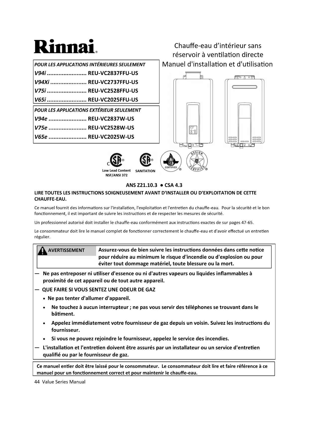V94e ..................... REU-VC2837W-US V75e ..................... REU-VC2528W-US V65e ..................... REU-VC2025W-US Faits importants sur votre chaue-eau Je vous remercie pour l'achat d'un chaue-eau sans réservoir Rinnai. Pour le bon fonconnement et la sécurité, il est important de suivre les instrucons et de respecter les mesures de sécurité. Toutes les instrucons et la garane lire aenvement avant d'exploitaon cee chaue-eau. Gardez ce manuel en lieu sûr. AVIS: Rinnai partage parfois des informaons de contact client avec des entreprises que nous croyons orent des produits ou des services qui peuvent vous être ules. En fournissant ces renseignements, vous acceptez que nous pouvons partager vos coordonnées à cee n. Si vous préférez ne pas avoir vos informaons partagées avec ces entreprises, veuillez contacter le service clientèle et demandez ne pas d'avoir votre informaon partagée. Nous allons cependant connuer à vous contacter avec les informaons pernentes pour le produit vous inscrit ou vous rendre compte avec nous. — Ne pas entreposer ni uliser d'essence ou ni d'autres vapeurs ou liquides inammables à proximité de cet appareil ou de tout autre appareil. — QUE FAIRE SI VOUS SENTEZ UNE ODEUR DE GAZ Laissez les lieux. Ne pas tenter d'allumer d'appareil. Ne touchez à aucun interrupteur ; ne pas vous servir des téléphones se trouvant dans le bâment. Appelez immédiatement votre fournisseur de gaz depuis un voisin. Suivez les instrucons du fournisseur. Si vous ne pouvez rejoindre le fournisseur, appelez le service des incendies. — L'installaon et l'entreen doivent être assurés par un installateur ou un service d'entreen qualié ou par le fournisseur de gaz. AVERTISSEMENT Assurez-vous de bien suivre les instrucons données dans cee noce pour réduire au minimum le risque d'incendie ou d'explosion ou pour éviter tout dommage matériel, toute blessure ou la mort.Value Series Manual 67 À LIRE AVANT LA MISE EN SERVICE POUR VOTRE SÉCURITÉ A. Cet appareil ne comporte pas de veilleuse. Il est muni d’un disposif d’allumage qui allume automaquement le brûleur. Ne tentez pas d’allumer la veilleuse manuellement. B. AVANT DE FAIRE FONCTIONNER, reniez tout autour de l’appareil pour déceler une odeur de gaz. Reniez près du plancher, car certains gaz sont plus lourds que l’air et peuvent s’accumuler au niveau du sol. QUE FAIRE SI VOUS SENTEZ UNE ODEUR DE GAZ : Ne pas tenter d’allumer d’appareil. Ne touchez à aucun interrupteur ; ne pas vous servir des téléphones se trouvant dans le bâment. Appelez immédiatement votre fournisseur de gaz depuis un voisin. Suivez les instrucons du fournisseur. Si vous ne pouvez rejoindre le fournisseur, appelez le service des incendies. C. Ne poussez ou tournez la manee d’admission du gaz qu’à la main ; ne jamais uliser d’oul. Si la manee reste coincée, ne pas tenter de la réparer ; appelez un technicien qualié. Le fait de forcer la manee ou de la réparer peut déclencher une explosion ou un incendie. D. N’ulisez pas cet appareil s’il a été plongé dans l’eau, même parellement. Faites inspecter l’appareil par un technicien qualié et remplacez toute pare du système de contrôle et toute commande qui ont été plongés dans l’eau. COMMENT COUPER L’ADMISSION DE GAZ DE L’APPAREIL