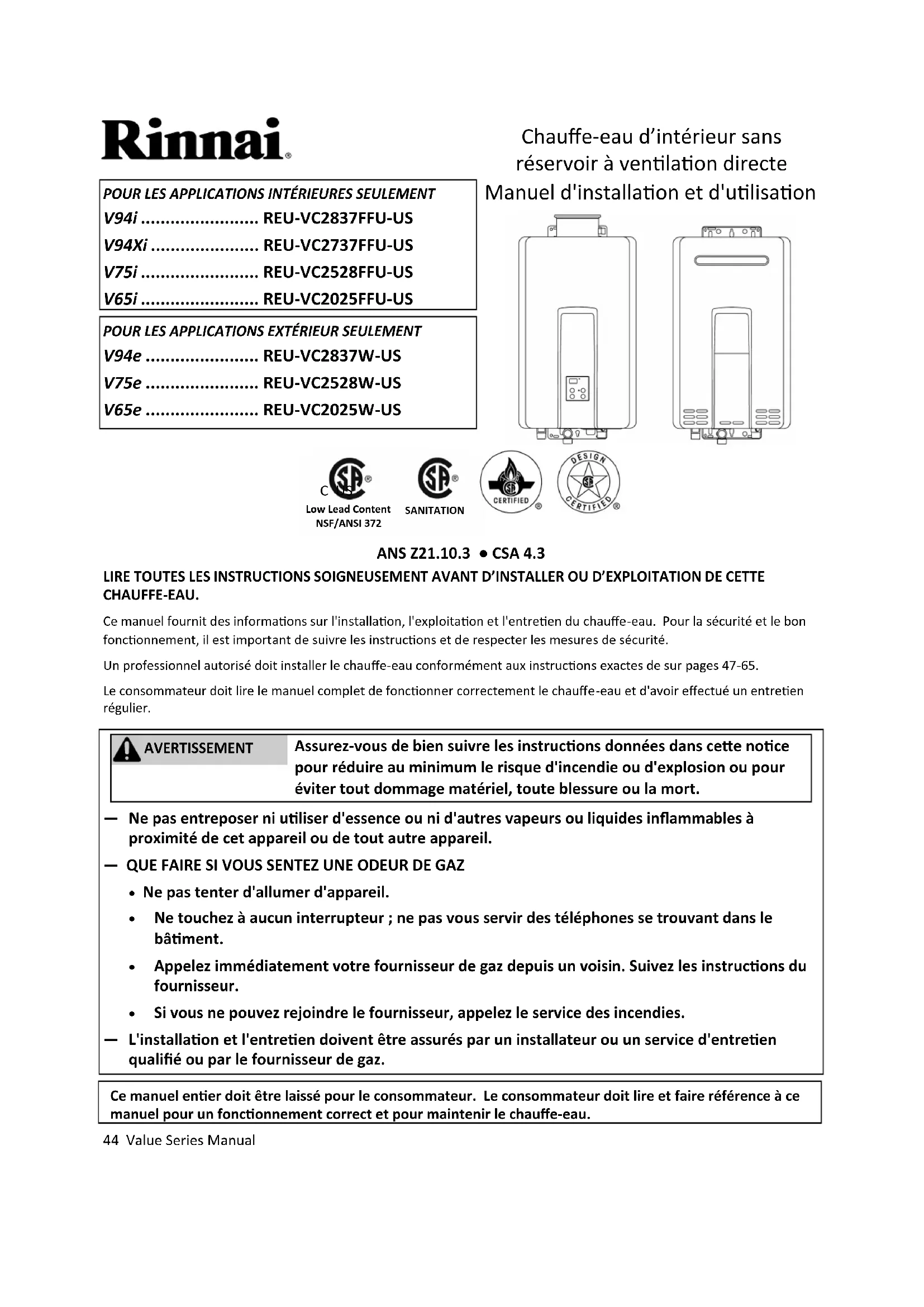 V94e ....................... REU-VC2837W-US V75e ....................... REU-VC2528W-US V65e ....................... REU-VC2025W-USValue Series Manual 45 Table des maères Table des maères .................................................. 45 Les praques et les comportements de sécurité pour les consommateurs et les installateurs .................. 46 Installaon d’instrucons (pour le professionnel autorisé) ......................... 47 Préparez-vous à l'installaon ........................ 48 Déterminez l'endroit d’installaon................ 49 Protecon de gel ........................................... 53 Liste de véricaon pour déterminer l'endroit d’installaon ................................... 54 Bâ à murer ................................................... 54 Enlevez le panneau avant .............................. 54 Installaon de la mise à l'air libre (modèles d'intérieur) ................................... 55 Condensat (modèles d'intérieur) .................. 57 Liste de véricaon pour l'évacuaon et de condesat (modèles d'intérieur) ............... 57 Installaon de la tuyauterie .......................... 58 Liste de véricaon pour tuyauterie ............ 60 Installaon de la fourniture de gaz ............... 60 Reliez l'électricité ........................................... 62 Ajustez à l'haute altude ............................... 62 Ajuster pour longueur de venlaon (modèles d'intérieur) .................................... 62 Liste de véricaon pour gaz et électricité .... 62 Installaon de le contrôleur de température 63 Liste de véricaon nale .............................. 64 Diagramme en escalier ........................................... 65 Instrucons d'ulisaon .................................... 66 Direcves d'opéraons du consommateur pour le fonconnement sécuritaire de votre chaue-eau ...................................................... 67 Comment utiliser le contrôleur de température ................................................ 68 Comment dénir la température .................... 69 Entreen requis ............................................... 71 Protecon et Winterizaon gel ................. 72 Flushing l'échangeur de chaleur ................ 73 Drainage Manuel du chaue-eau.............. 74 Garane du consommateur ................................... 75 Indicaon d’une situaon imminente dangereuse, qui, si elle n’est pas évitée, peut entraîner des blessures graves voire mortelles. Indicaon d’une situaon potenellement dangereuse, qui, si elle n’est pas évitée, peut en- traîner des blessures graves voire mortelles Indicaon d’une situaon potenellement dangereuse, qui si elle n’est pas évitée peut entraîner des blessures légères ou moyennes. On peur également l’uliser pour signaler des praques non sûres. DANGER ATTENTION AVERTISSEMENT Dénions de sécurité Ceci est un symbole relaf à la sécurité. Il vous prévient de dangers potenels qui peuvent blesser ou tuer, vous- même et les autres. L'informaon de sûreté importante AVIS: Rinnai partage parfois des informaons de contact client avec des entreprises que nous croyons orent des produits ou des services qui peuvent vous être ules. En fournissant ces renseignements, vous accept-ez que nous pouvons partager vos coordonnées à cee n. Si vous préférez ne pas avoir vos informaons partagées avec ces entreprises, veuillez contacter le service clientèle et demandez ne pas d'avoir votre in-formaon partagée. Nous allons cependant connuer à vous contacter avec les informaons pernentes pour le produit vous inscrit ou vous rendre compte avec nous. Si vous avez des quesons ou se sentent que le manuel est incomplète, veuillez communiquer avec Rinnai au 1-800-621-9419.46 Value Series Manual ATTEN-