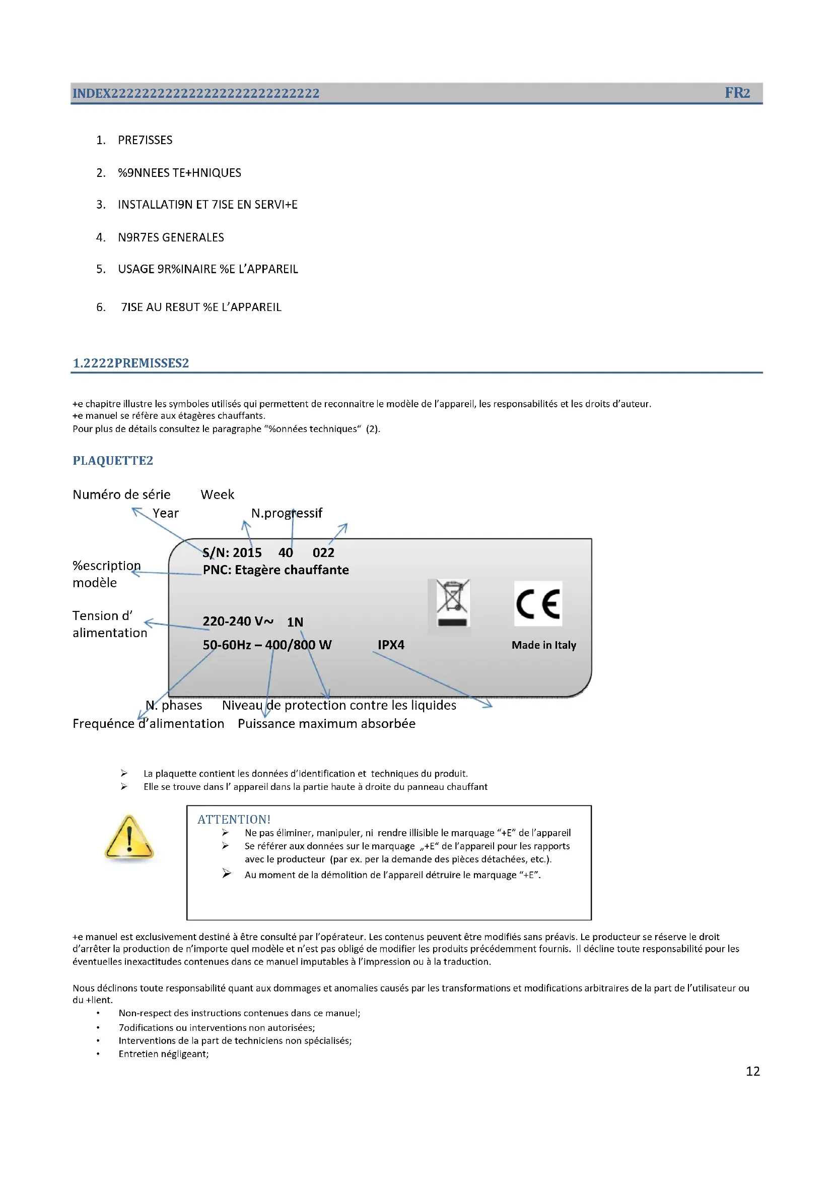 Ce chapitre illustre les symboles utilisés qui permettent de reconnaitre le modèle de l’appareil, les responsabilités et les droits d’auteur. Ce manuel se réfère aux étagères chauffants. Pour plus de détails consultez le paragraphe “Données techniques“ (2). PLAQUETTE Numéro de série Week Year N.progressif