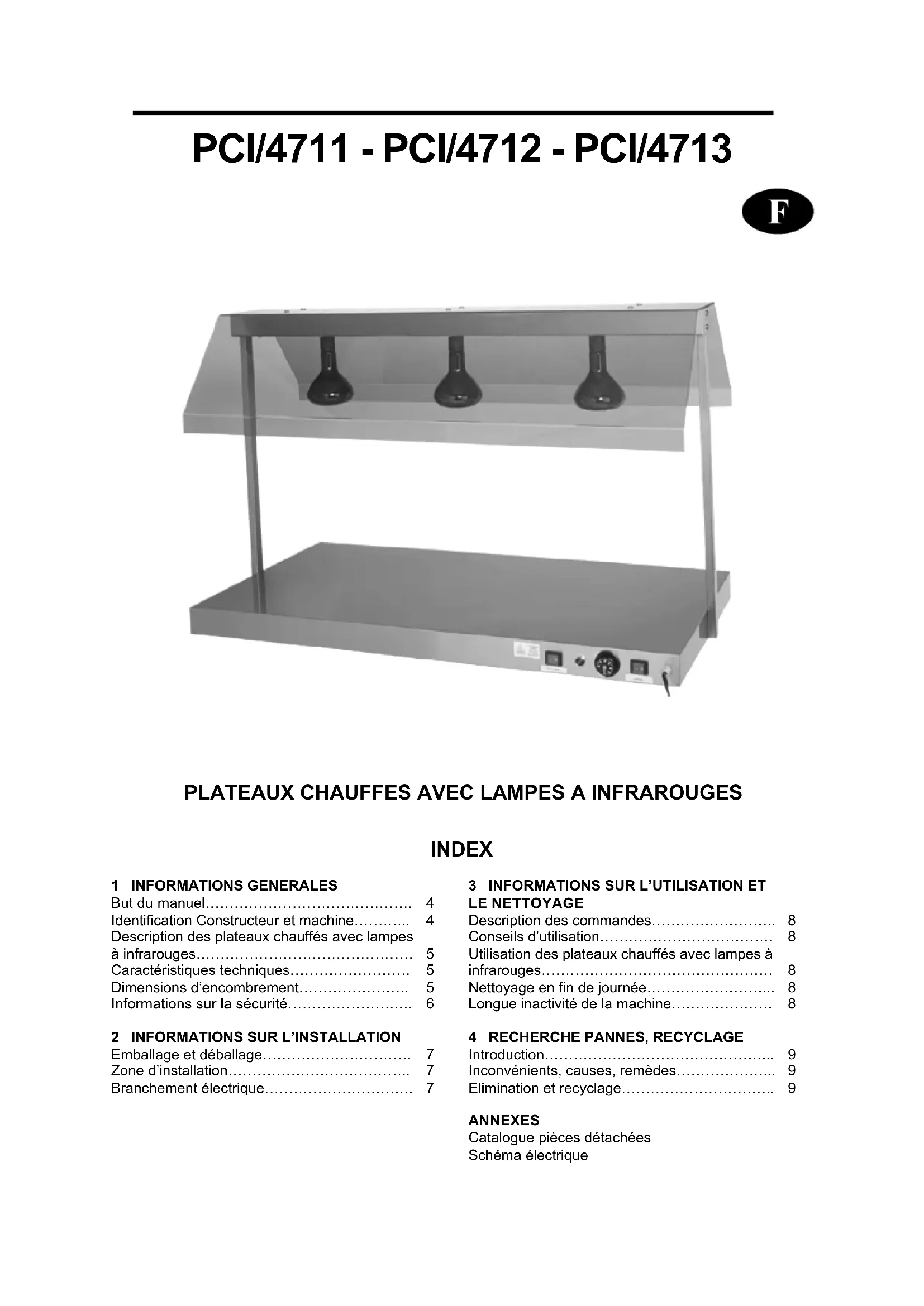 Introduction En cas de pannes ou mauvais fonctionnement, débrancher la fiche de la prise de courant et contacter le Service Assistance de votre Revendeur. Eviter de démonter les parties internes de la machine. Le constructeur décline toute responsabilité pour les éventuelles altérations! Inconvénients, causes, remèdes Inconvénient Cause RemèdeInterrupteur général déclenché Enclencher l’interrupteur généralLa machine ne chauffe pasManque de tension sur la ligned’alimentationContacter le Service Assistance de votreRevendeurLa résistance ne fonctionne pasContacter le Service Assistance de votreRevendeur Elimination et recyclage La machine a été étudiée et construite pour une durée moyenne de 10.000 heures de fonctionnement. Au terme de l’utilisation de la machine, suivre les lois nationales pour l’élimination et le recyclage. Nous vous invitons à contacter les autorités pour l’environnement ou les organismes autorisés.PCI/4711 - PCI/4712 - PCI/4713