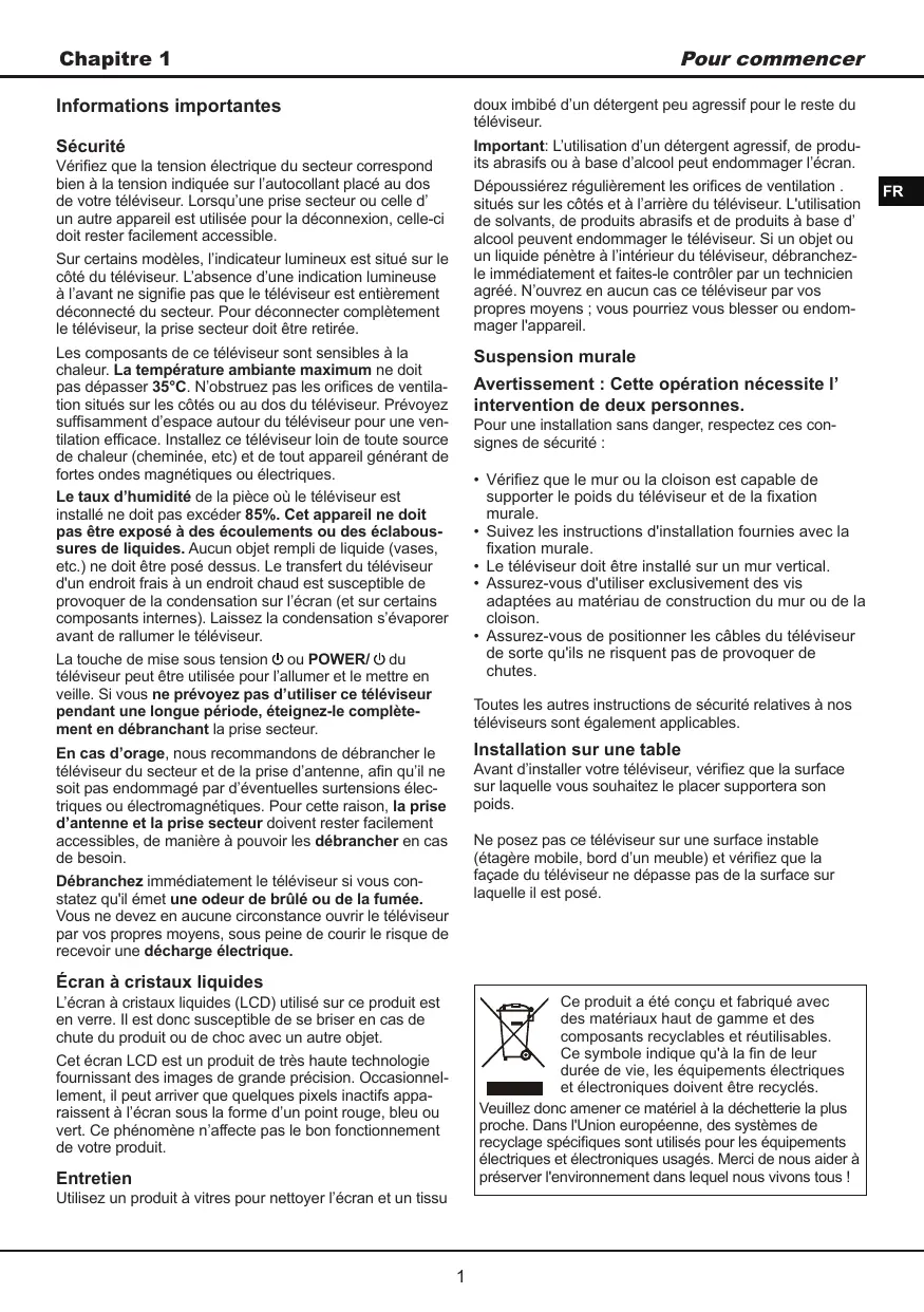 • Assurez-vous de positionner les câbles du téléviseur de sorte qu'ils ne risquent pas de provoquer de chutes. Toutes les autres instructions de sécurité relatives à nos téléviseurs sont également applicables. Installation sur une table En cas d’orage, nous recommandons de débrancher le téléviseur du secteur et de la prise d’antenne, afin qu’il ne soit pas endommagé par d’éventuelles surtensions électriques ou électromagnétiques. Pour cette raison, la prise d’antenne et la prise secteur doivent rester facilement accessibles, de manière à pouvoir les débrancher en cas de besoin. Avant d’installer votre téléviseur, vérifiez que la surface sur laquelle vous souhaitez le placer supportera son poids. Ne posez pas ce téléviseur sur une surface instable (étagère mobile, bord d’un meuble) et vérifiez que la façade du téléviseur ne dépasse pas de la surface sur laquelle il est posé. Débranchez immédiatement le téléviseur si vous constatez qu'il émet une odeur de brûlé ou de la fumée. Vous ne devez en aucune circonstance ouvrir le téléviseur par vos propres moyens, sous peine de courir le risque de recevoir une décharge électrique. Écran à cristaux liquides Ce produit a été conçu et fabriqué avec des matériaux haut de gamme et des composants recyclables et réutilisables. Ce symbole indique qu'à la fin de leur durée de vie, les équipements électriques et électroniques doivent être recyclés. Veuillez donc amener ce matériel à la déchetterie la plus proche. Dans l'Union européenne, des systèmes de recyclage spécifiques sont utilisés pour les équipements électriques et électroniques usagés. Merci de nous aider à préserver l'environnement dans lequel nous vivons tous ! L’écran à cristaux liquides (LCD) utilisé sur ce produit est en verre. Il est donc susceptible de se briser en cas de chute du produit ou de choc avec un autre objet. Cet écran LCD est un produit de très haute technologie fournissant des images de grande précision. Occasionnellement, il peut arriver que quelques pixels inactifs apparaissent à l’écran sous la forme d’un point rouge, bleu ou vert. Ce phénomène n’affecte pas le bon fonctionnement de votre produit. Entretien Utilisez un produit à vitres pour nettoyer l’écran et un tissu