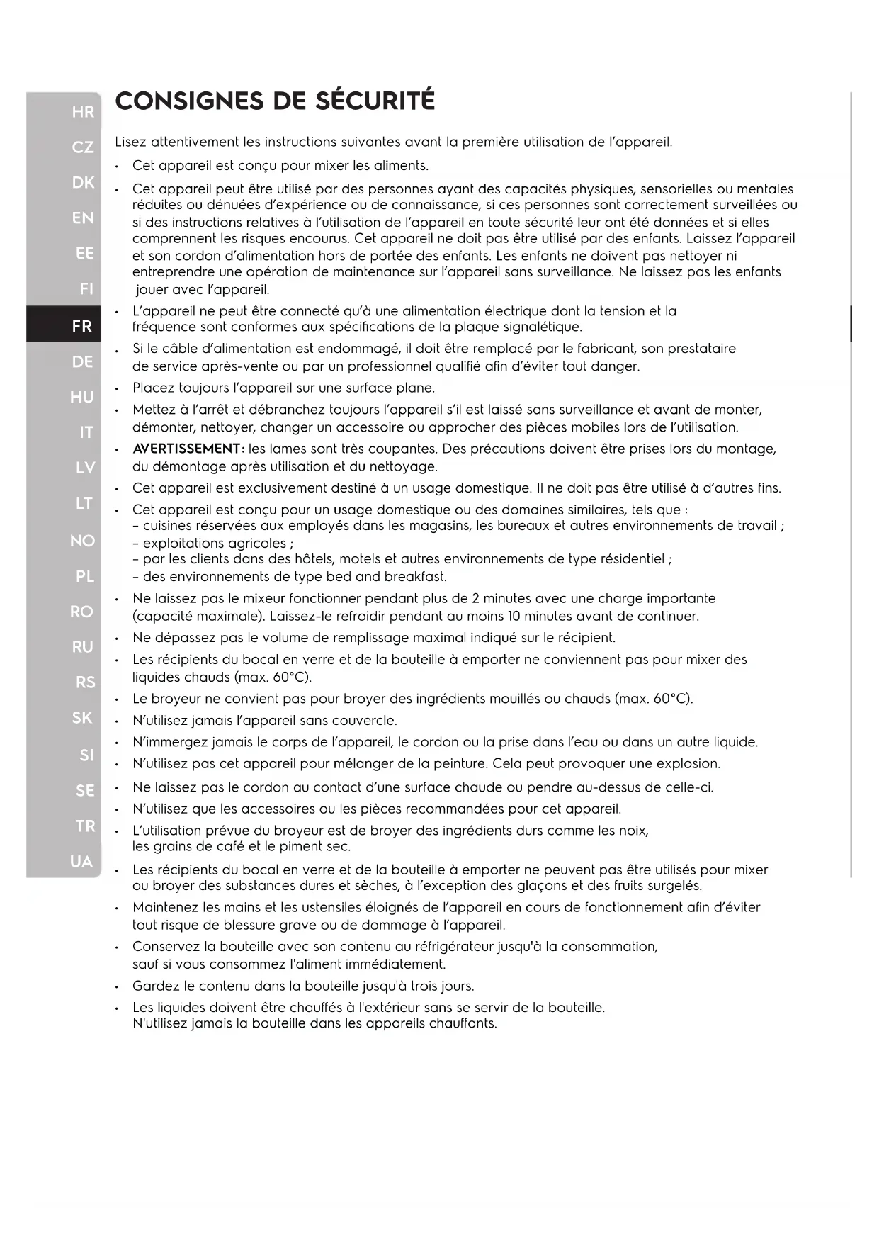du démontage après utilisation et du nettoyage. Cet appareil est exclusivement destiné à un usage domestique. Il ne doit pas être utilisé à d’autres f ins. Cet appareil est conçu pour un usage domestique ou des domaines similaires, tels que : – cuisines réservées aux employés dans les magasins, les bureaux et autres environnements de travail ; – exploitations agricoles ; – par les clients dans des hôtels, motels et autres environnements de type résidentiel ; – des environnements de type bed and breakfast. Ne laissez pas le mixeur fonctionner pendant plus de 2 minutes avec une charge importante (capacité maximale). Laissez-le refroidir pendant au moins 10 minutes avant de continuer. Ne dépassez pas le volume de remplissage maximal indiqué sur le récipient. Les récipients du bocal en verre et de la bouteille à emporter ne conviennent pas pour mixer des liquides chauds (max. 60°C). Le broyeur ne convient pas pour broyer des ingrédients mouillés ou chauds (max. 60°C). N’utilisez jamais l’appareil sans couvercle. N’immergez jamais le corps de l’appareil, le cordon ou la prise dans l’eau ou dans un autre liquide. N’utilisez pas cet appareil pour mélanger de la peinture. Cela peut provoquer une explosion. Ne laissez pas le cordon au contact d’une surface chaude ou pendre au-dessus de celle-ci. N’utilisez que les accessoires ou les pièces recommandées pour cet appareil. L’utilisation prévue du broyeur est de broyer des ingrédients durs comme les noix, les grains de café et le piment sec. Les récipients du bocal en verre et de la bouteille à emporter ne peuvent pas être utilisés pour mixer ou broyer des substances dures et sèches, à l’exception des glaçons et des fruits surgelés. Maintenez les mains et les ustensiles éloignés de l’appareil en cours de fonctionnement af in d’éviter tout risque de blessure grave ou de dommage à l’appareil. Conservez la bouteille avec son contenu au réfrigérateur jusqu'à la consommation, sauf si vous consommez l'aliment immédiatement. Gardez le contenu dans la bouteille jusqu'à trois jours. Les liquides doivent être chauf fés à l'extérieur sans se servir de la bouteille. N'utilisez jamais la bouteille dans les appareils chauf fants.HR