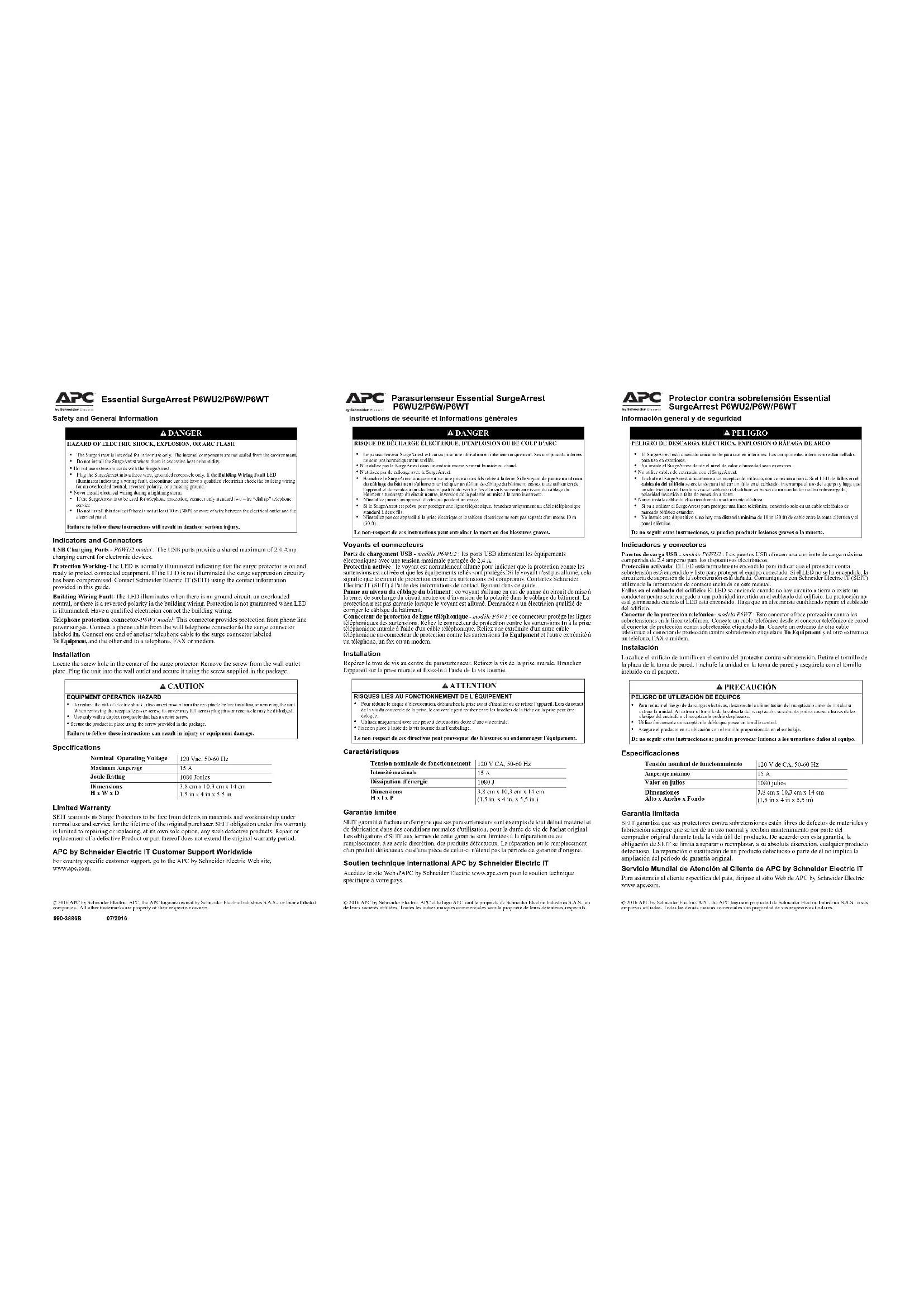 990-3886B 07/2016 Essential SurgeArrest P6WU2/P6W/P6WT Protector contra sobretensión Essential SurgeArrest P6WU2/P6W/P6WT © 2016 APC by Schneider Electric. APC, the APC logo are owned by Schneider Electric Industries S.A.S., or their affiliated companies. All other trademarks are property of their respective owners. Parasurtenseur Essential SurgeArrest P6WU2/P6W/P6WT © 2016 APC by Schneider Electric. APC et le logo APC sont la propriété de Schneider Electric Industries S.A.S., ou de leurs sociétés affiliées. Toutes les autres marques commerciales sont la propriété de leurs détenteurs respectifs.© 2016 APC by Schneider Electric. APC, the APC logo son propiedad de Schneider Electric Industries S.A.S., o sus empresas afiliadas. Todas las demás marcas comerciales son propiedad de sus respectivos titulares. Instructions de sécurité et informations générales Voyants et connecteurs Ports de chargement USB - modèle P6WU2 : les ports USB alimentent les équipements électroniques avec une tension maximale partagée de 2,4 A. Protection activée : le voyant est normalement allumé pour indiquer que la protection contre les surtensions est activée et que les équipements reliés sont protégés. Si le voyant n'est pas allumé, cela signifie que le circuit de protection contre les surtensions est compromis. Contactez Schneider Electric IT (SEIT) à l'aide des informations de contact figurant dans ce guide. Panne au niveau du câblage du bâtiment : ce voyant s'allume en cas de panne du circuit de mise à la terre, de surcharge du circuit neutre ou d'inversion de la polarité dans le câblage du bâtiment. La protection n'est pas garantie lorsque le voyant est allumé. Demandez à un électricien qualifié de corriger le câblage du bâtiment. Connecteur de protection de ligne téléphonique - modèle P6WT : ce connecteur protège les lignes téléphoniques des surtensions. Reliez le connecteur de protection contre les surtensions In à la prise téléphonique murale à l'aide d'un câble téléphonique. Reliez une extrémité d'un autre câble téléphonique au connecteur de protection contre les surtensions To Equipment et l'autre extrémité à un téléphone, un fax ou un modem. Installation Repérez le trou de vis au centre du parasurtenseur. Retirez la vis de la prise murale. Branchez l'appareil sur la prise murale et fixez-le à l'aide de la vis fournie. Caractéristiques Garantie limitée SEIT garantit à l'acheteur d'origine que ses parasurtenseurs sont exempts de tout défaut matériel et de fabrication dans des conditions normales d'utilisation, pour la durée de vie de l'achat original. Les obligations d'SEIT aux termes de cette garantie sont limitées à la réparation ou au remplacement, à sa seule discrétion, des produits défectueux. La réparation ou le remplacement d'un produit défectueux ou d'une pièce de celui-ci n'étend pas la période de garantie d'origine. Soutien technique international APC by Schneider Electric IT Accédez le site Web d'APC by Schneider Electric www.apc.com pour le soutien technique spécifique à votre pays. DANGER RISQUE DE DÉCHARGE ÉLECTRIQUE, D'EXPLOSION OU DE COUP D'ARC