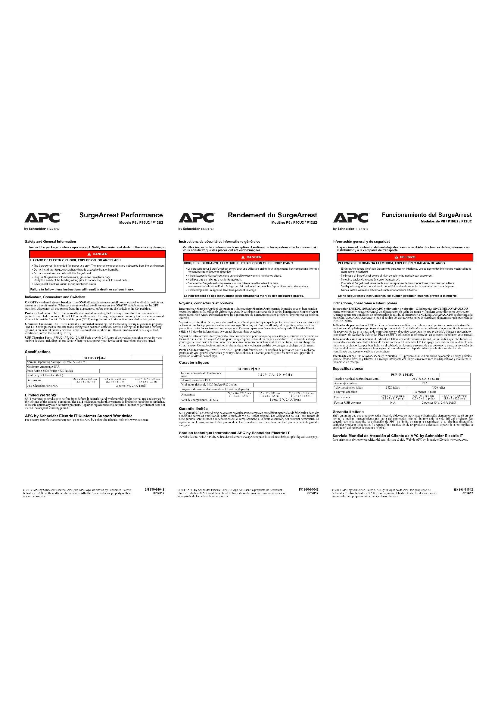 Specifications Limited Warranty SEIT warrants its products to be free from defects in materials and workmanship under normal use and service for the lifetime of the original purchaser. The SEIT obligation under this warranty is limited to repairing or replacing, at its sole option, any such defective products. Repair or replacement of a defective Product or part thereof does not extend the original warranty period. APC by Schneider Electric IT Customer Support Worldwide For country specific customer support, go to the APC by Schneider Electric Web site, www.apc.com. P8 P10U2 P12U2Nominal Operating Voltage 120 Vac, 50-60 HzMaximum Amperage 15 AJoule Rating 3420 Joules 4320 JoulesCord Length 1.8 meters (6 ft.)Dimensions27.6 x 76 x 298.5 mm (1.1 x 3 x 11.7 in)32 x 127 x 286 mm(1.2 x 5 x 11.3 in)33.3 * 127 * 310.9 mm(1.3 x 5 x 12.2 in)USB Charging Ports N/A2 ports (5V, 2.4A Total) Safety and General Information Inspect the package contents upon receipt. Notify the carrier and dealer if there is any damage. Indicators, Connectors and Switches ON/OFF switch and circuit breaker: The ON/OFF switch provides on/off power control to all of the outlets and serves as a circuit breaker. When an output overload condition occurs the ON/OFF switch moves to the OFF position. Disconnect all equipment from the SurgeArrest before moving the switch to the ON position. Protected Indicator: The LED is normally illuminated indicating that the surge protector is on and ready to protect connected equipment. If the LED is not illuminated the surge suppression circuitry has been compromised. Contact Schneider Electric Technical Support (SEIT) using the contact information provided in this guide. Grounded Indicator: The LED is normally illuminated indicating that the building wiring is grounded properly. The LED extinguishes to indicate that a wiring fault has been detected. Possible wiring faults include a missing ground, a hot neutral polarity reversal, or an overloaded neutral circuit. Discontinue use and have a qualified electrician correct the building wiring. USB Charging Ports (P10U2 / P12U2): 2 USB Ports provide 2.4 Amps of convenient charging power for your mobile devices, including tablets. Smart Charging recognizes your devices and maximizes charging speed. DANGER HAZARD OF ELECTRIC SHOCK, EXPLOSION, OR ARC FLASH• The SurgeArrest is intended for indoor use only. The internal components are not sealed from the environment.• Do not install the SurgeArrest where there is excessive heat or humidity.• Do not use extension cords with the SurgeArrest.• Plug the SurgeArrest into a three wire, grounded receptacle only.Verify the safety of the building wiring prior to connecting the unit to a wall outlet.• Never install electrical wiring during a lightning storm.Failure to follow these instructions will result in death or serious injury. SurgeArrest Performance Models P8 / P10U2 / P12U2 EN 990-9104207/2017© 2017 APC by Schneider Electric. APC, the APC logo are owned by Schneider Electric Industries S.A.S., or their affiliated companies. All other trademarks are property of their respective owners. Rendement du SurgeArrest Modèles P8 / P10U2 / P12U2 FC 990-9104207/2017© 2017 APC by Schneider Electric. APC, le logo APC sont la propriété de Schneider Electric Industries S.A.S. ou de leurs filiales. Toutes les autres marques commerciales sont la propriété de leurs détenteurs respectifs. Funcionamiento del SurgeArrest Modelos de P8 / P10U2 / P12U2 ES 990-9104207/2017© 2017 APC by Schneider Electric. APC y el logotipo de APC son propiedad de Schneider Electric Industries S.A.S o sus empresas afiliadas. Todas las demás marcas comerciales son propiedad de sus respectivos titulares. Caractéristiques Garantie limitée SEIT garantit à l’acheteur d’origine que ses produits sont exempts de tout défaut matériel et de fabrication dans des conditions normales d’utilisation, pour la durée de vie de l’achat original. Les obligations de SEIT aux termes de cette garantie sont limitées à la réparation ou au remplacement, à sa seule discrétion, des produits défectueux. La réparation ou le remplacement d'un produit défectueux ou d'une pièce de celui-ci n'étend pas la période de garantie d'origine. Soutien technique international APC by Schneider Electric IT Accédez le site Web d'APC by Schneider Electric www.apc.com pour le soutien technique spécifique à votre pays. P8 P10U2 P12U2Tension nominale de fonctionne- ment 120V CA, 50-60HzIntensité maximale 15 ADissipation d'énergie 3420 Joules 4320 JoulesLongueur du cordon d'alimentation 1,8 mètres (6 pieds)Dimensions27,6 x 76 x 298,5 mm (1.1 x 3 x 11,7 po)32 x 127 x 286 mm(1.2 x 5 x 11,3 po)33,3 × 127 × 310,9 mm(1.3 x 5 x 12,2 po)Ports de chargement USB N/A2 ports (5 V, 2,4 A Total) Instructions de sécurité et informations générales Veuillez inspecter le contenu dès la réception. Avertissez le transporteur et le fournisseur si vous constatez que des pièces ont été endommagées. Voyants, connecteurs et boutons Interrupteur Marche/Arrêt et disjoncteur : l'interrupteur Marche/Arrêt permet de mettre sous et hors tension toutes les prises et fait office de disjoncteur. Dans le cas d'une surcharge de la sortie, l'interrupteur Marche/Arrêt passe en position Arrêt. Débranchez tous les équipements du SurgeArrest avant de placer l'interrupteur en position Marche. Voyant de protection : le voyant est normalement allumé pour indiquer que la protection contre les surtensions est activée et que les équipements reliés sont protégés. Si le voyant n'est pas allumé, cela signifie que le circuit de protection contre les surtensions est compromis. Communiquez avec le soutien technique de Schneider Electric (SEIT) à l’aide des informations de contact figurant dans ce guide. Voyant de mise à terre : le voyant est allumé normalement pour indiquer que le câblage électrique du bâtiment est bien relié à la terre. Le voyant s'éteint pou