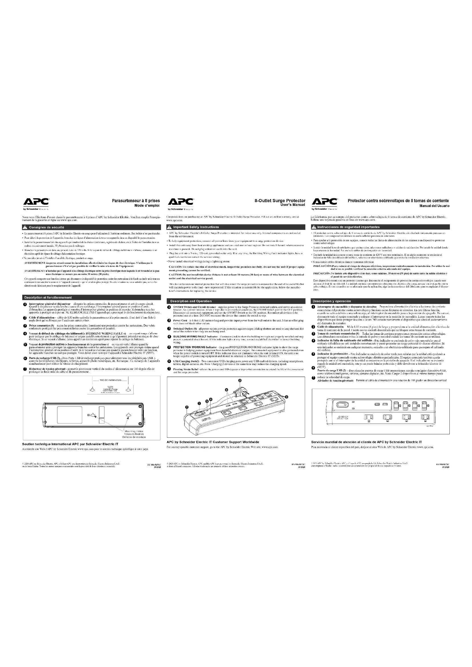 TIMENT WIRING FAULT ») – ce voyant rouge s’allume pour indiquer que le câblage du bâtiment n’est pas installé correctement et qu’il pourrait présenter un risque de choc électrique. Si ce voyant s’allume, faites appel à un électricien agréé pour réparer le câblage du bâtiment. Voyant de protection active (« fonctionnement de la protection ») – ce voyant vert s’allume quand le parasurtenseur aide à protèger les appareils branchés contre les surtensions. Les appareils sont protégés même quand l’interrupteur général est en position d’arrêt. Si le voyant ne s’allume pas quand le parasurtenseur entre en fonction, les appareils branchés ne sont pas protégés. Vous devez alors renvoyer l’appareil à Schneider Electric IT (SEIT). Ports de recharge USB (2) - Deux Ports USB de recharge pratiques pour alimenter tous les périphériques USB, y compris les téléphones intelligents, tablettes, appareils photo numériques, etc. Remarque : La recharge de 2 appareils simultanément peut réduire la vitesse de chargement. Réducteur de tension pivotant – permet le pivotement vertical du cordon d’alimentation sur 180 degrés afin de prolonger la durée utile du câble et du parasurtenseur. Description et fonctionnement Mounting HolesTrous de fixationOrificios de montaje