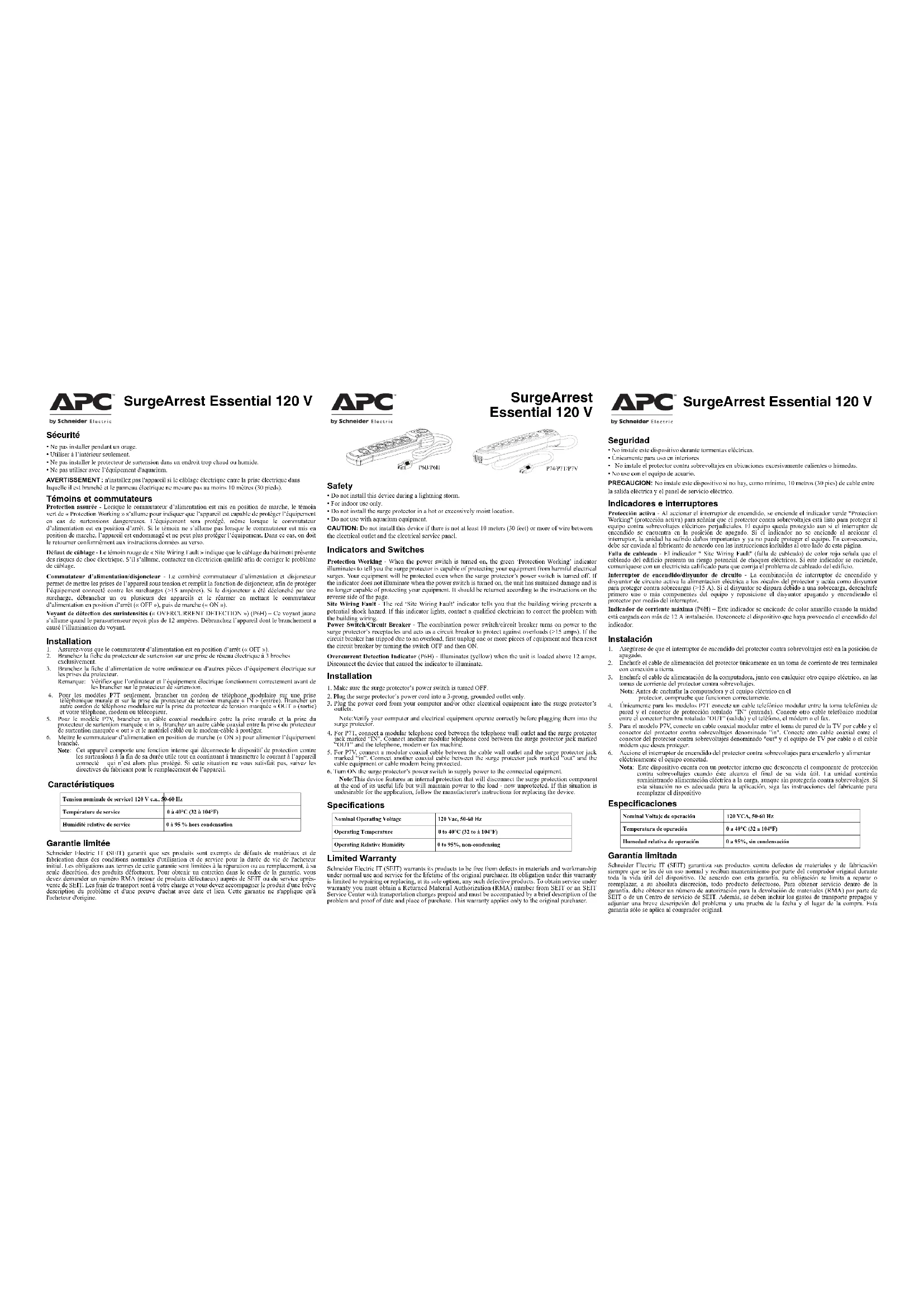 eléctricamente el equipo conectad. Nota: Este dispositivo cuenta con un protector interno que desconecta el componente de protección contra sobrevoltajes cuando éste alcanza el final de su vida útil. La unidad continúa suministrando alimentación eléctrica a la carga, aunque sin protegerla contra sobrevoltajes. Si esta situación no es adecuada para la aplicación, siga las instrucciones del fabricante para reemplazar el dispositivo Especificaciones Garantía limitada Schneider Electric IT (SEIT) garantiza sus productos contra defectos de materiales y de fabricación siempre que se les dé un uso normal y reciban mantenimiento por parte del comprador original durante toda la vida útil del dispositivo. De acuerdo con esta garantía, su obligación se limita a reparar o reemplazar, a su absoluta discreción, todo producto defectuoso. Para obtener servicio dentro de la garantía, debe obtener un número de autorización para la devolución de materiales (RMA) por parte de SEIT o de un Centro de servicio de SEIT. Además, se deben incluir los gastos de transporte prepagos y adjuntar una breve descripción del problema y una prueba de la fecha y el lugar de la compra. Esta garantía sólo se aplica al comprador original. SurgeArrest Essential 120 V Caractéristiques Tension nominale de service1 120 V c.a., 50-60 HzTempérature de service 0 à 40°C (32 à 104°F)Humidité relative de service 0 à 95 % hors condensation Nominal Operating Voltage 120 Vac, 50-60 HzOperating Temperature 0 to 40°C (32 to à 104°F)Operating Relative Humidity 0 to 95%, non-condensing SurgeArrest Essential 120 V P74/P7T/P7V P6B/P6H Nominal Voltaje de operación 120 VCA, 50-60 HzTemperatura de operación 0 a 40°C (32 a 104°F)Humedad relativa de operación 0 a 95%, sin condensación SurgeArrest Essential 120 VCETTE DÉCLARATION DE PROTECTION N'EST PAS UNE GARANTIE. VEUILLEZ VOUS RÉFÉRER À LA GARANTIE LIMITÉE D'APC BY SCHNEIDER ELECTRIC POUR TOUTE INFORMATION CONCERNANT LA GARANTIE QUI ACCOMPAGNE VOTRE PRODUIT APC BY SCHNEIDER ELECTRIC. LES LIMITATIONS ET CONDITIONS CONTENUES DANS CETTE DÉCLARATION DE PROTECTION N'ONT AUCUNE INCIDENCE SUR LES TERMES DE LA GARANTIE. « Déclaration de protection d'appareils » « Dans les 50 états des États-Unis, le Canada, Porto Rico et les Bermudes pour produits à 120 volts » Si votre appareil électronique est endommagé par des phénomènes transitoires transmis par une ligne électrique c.a. (de 120 Volts) alors qu'il était directement et correctement connecté à un produit APC by Schneider Electric de 120 Volts standard couvert par la déclaration de protection d'appareils (« appareil connecté ») et si toutes les conditions spécifiées ci-dessous sont remplies, Schneider Electric (SEIT) s'engage, SEIT à son entière discrétion et durant la période indiquée ci-dessous, à remplacer le produit APC by Schneider Electric et soit (a) à payer la réparation de l'appareil connecté, soit (b) à rembourser l'appareil connecté à sa juste valeur marchande, telle qu'elle figure dans la version courante du Orion Blue Book (ou équivalent), jusqu'à concurrence des montants stipulés ci-dessous, si SEIT détermine que le dommage a été causé par le manquement du produit APC by Schneider Electric à protéger l'appareil connecté contre les phénomènes transitoires transmis par une ligne d'électricité c.a. (ligne téléphonique, de réseau ou de câblodistribution, le cas échéant). Les transitoires de ligne d'alimentation pour lesquels APC by Schneider Electric ont été conçus pour la protection, tels que reconnus par les normes de l'industrie, comprennent les pointes et les surtensions sur les lignes d'alimentation CA (non destinés à protéger contre les surtensions telles que définies par la norme IEEE 1100-1992). La protection contre les transitoires de ligne téléphonique s'applique uniquement aux APC by Schneider Electric qui offrent une protection de ligne téléphonique, et dans les cas où une telle protection est disponible, l'équipement de service téléphonique doit comporter un dispositif installé et fonctionnant correctement de «protection primaire» à l'entrée de service (de tels dispositifs sont normalement ajoutés lors de l'installation du téléphone) pour être couverts par les transitoires de ligne téléphonique. La protection contre les phénomènes transitoires des appareils de câblodistribution connectés s'applique uniquement aux produits APC by Schneider Electric offrant une telle protection, et dans ces cas, le service de câblodistribution doit être correctement mis à la terre selon les normes NEC (Code National de l'électricité des États-Unis). La protection contre les phénomènes transitoires sur les lignes de réseau s'applique uniquement aux produits APC by Schneider Electric offrant la protection des lignes de réseau. Cette politique de Schneider Electric s'applique aux produits APC by Schneider Electric ProtectNet si la ligne d'alimentation de l'équipement qu'ils protègent utilise seulement les produits de APC by Schneider Electric, avec une politique de protection d'équipement applicable, pour la protection contre les transitoires de lignes électriques. La couverture du produit ProtectNet sera alors couverte par la politique de protection électrique d'équipements de l'APC by Schneider Electric. Cette politique ne s'applique pas aux produits APC by Schneider Electric ProtectNet s'ils sont utilisés individuellement sans les produits de protection d'alimentation électrique CA de l'APC by Schneider Electric. SEIT se réserve le droit de déterminer si les dommages causés par une défaillance du produit d'APC by Schneider Electric en demandant que l'équipement endommagé soit envoyé à Schneider Electric pour inspection. Cette politique est excédentaire et ne s'applique que dans la mesure nécessaire au-delà de toute couverture pour les dommages matériels fournis par d'autres sources, y compris