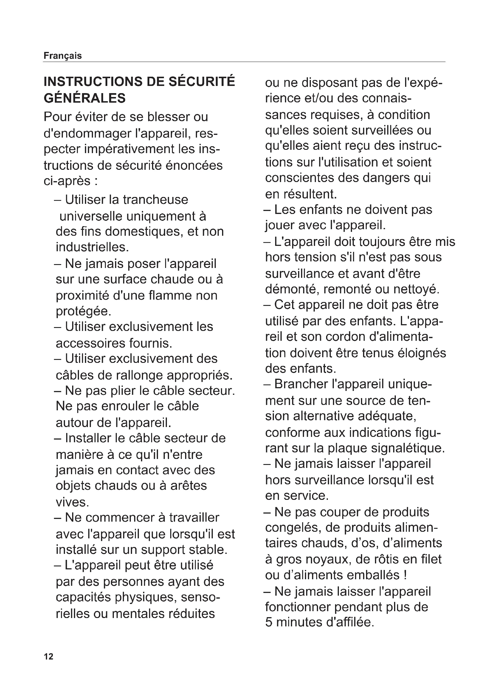 Pour éviter de se blesser ou d'endommager l'appareil, res- pecter impérativement les ins- tructions de sécurité énoncées ci-après : – Utiliser la trancheuse universelle uniquement à des ns domestiques, et non industrielles. – Ne jamais poser l'appareil sur une surface chaude ou à proximité d'une amme non protégée. – Utiliser exclusivement les accessoires fournis. – Utiliser exclusivement des câbles de rallonge appropriés. – Ne pas plier le câble secteur. Ne pas enrouler le câble autour de l'appareil. – Installer le câble secteur de manière à ce qu'il n'entre jamais en contact avec des objets chauds ou à arêtes vives. – Ne commencer à travailler avec l'appareil que lorsqu'il est installé sur un support stable. – L'appareil peut être utilisé par des personnes ayant des capacités physiques, senso- rielles ou mentales réduites ou ne disposant pas de l'expé