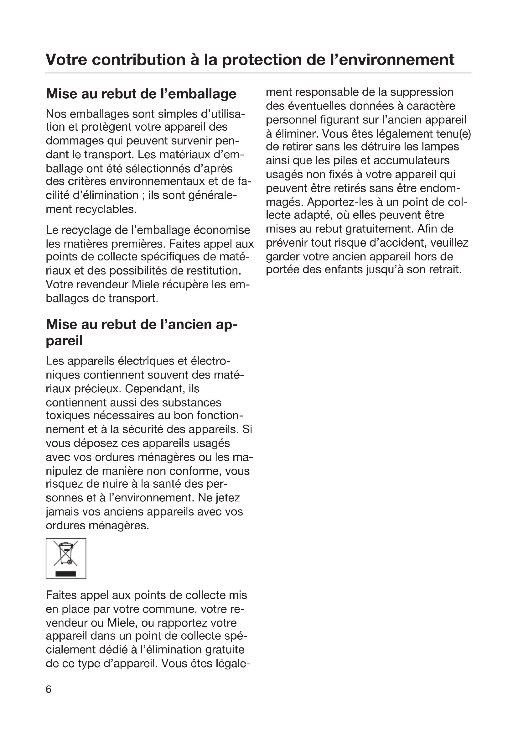 Mise au rebut de l’emballage Nos emballages sont simples d’utilisa- tion et protègent votre appareil des dommages qui peuvent survenir pen- dant le transport. Les matériaux d’em- ballage ont été sélectionnés d’après des critères environnementaux et de fa- cilité d’élimination;ils sont générale- ment recyclables. Le recyclage de l’emballage économise les matières premières. Faites appel aux points de collecte spécifiques de maté- riaux et des possibilités de restitution. Votre revendeur Miele récupère les em- ballages de transport. Mise au rebut de l’ancien ap- pareil Les appareils électriques et électro- niques contiennent souvent des maté- riaux précieux. Cependant, ils contiennent aussi des substances toxiques nécessaires au bon fonction- nement et à la sécurité des appareils. Si vous déposez ces appareils usagés avec vos ordures ménagères ou les ma- nipulez de manière non conforme, vous risquez de nuire à la santé des per- sonnes et à l’environnement. Ne jetez jamais vos anciens appareils avec vos ordures ménagères. Faites appel aux points de collecte mis en place par votre commune, votre re- vendeur ou Miele, ou rapportez votre appareil dans un point de collecte spé- cialement dédié à l’élimination gratuite de ce type d’appareil. Vous êtes légale- ment responsable de la suppression des éventuelles données à caractère personnel figurant sur l’ancien appareil à éliminer. Vous êtes légalement tenu(e) de retirer sans les détruire les lampes ainsi que les piles et accumulateurs usagés non fixés à votre appareil qui peuvent être retirés sans être endom- magés. Apportez-les à un point de col- lecte adapté, où elles peuvent être mises au rebut gratuitement. Afin de prévenir tout risque d’accident, veuillez garder votre ancien appareil hors de portée des enfants jusqu’à son retrait.Consignes de sécurité et mises en garde