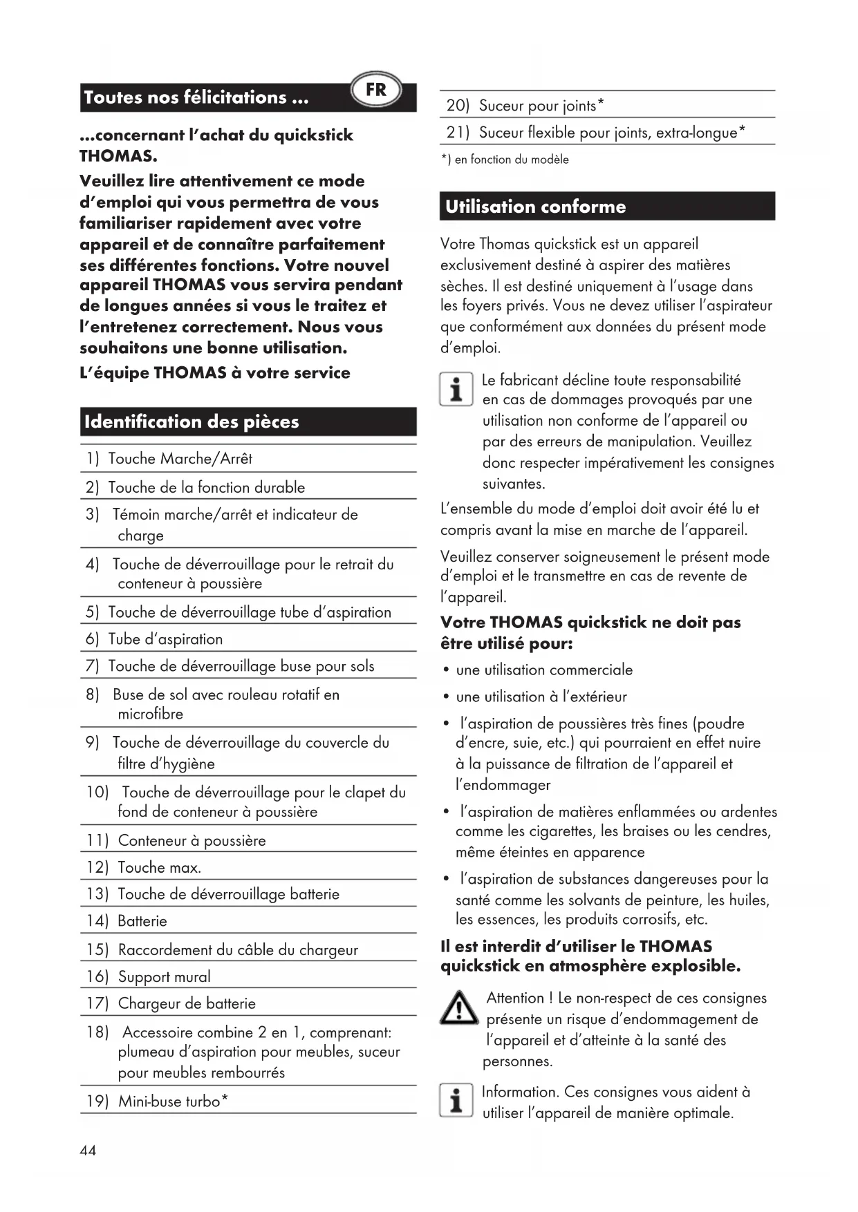 compensation for damage caused outside of the appliance – providing there is no legally stipula- ted liability for this – are excluded. We also offer you our customer service beyond the expiry of your warranty period. Please consult your dealer or contact our customer service department directly.44 Toutes nos félicitations … …concernant l’achat du quickstick THOMAS. Veuillez lire attentivement ce mode d’emploi qui vous permettra de vous familiariser rapidement avec votre appareil et de connaître parfaitement ses différentes fonctions. Votre nouvel appareil THOMAS vous servira pendant de longues années si vous le traitez et l’entretenez correctement. Nous vous souhaitons une bonne utilisation. L’équipe THOMAS à votre service Identification des pièces