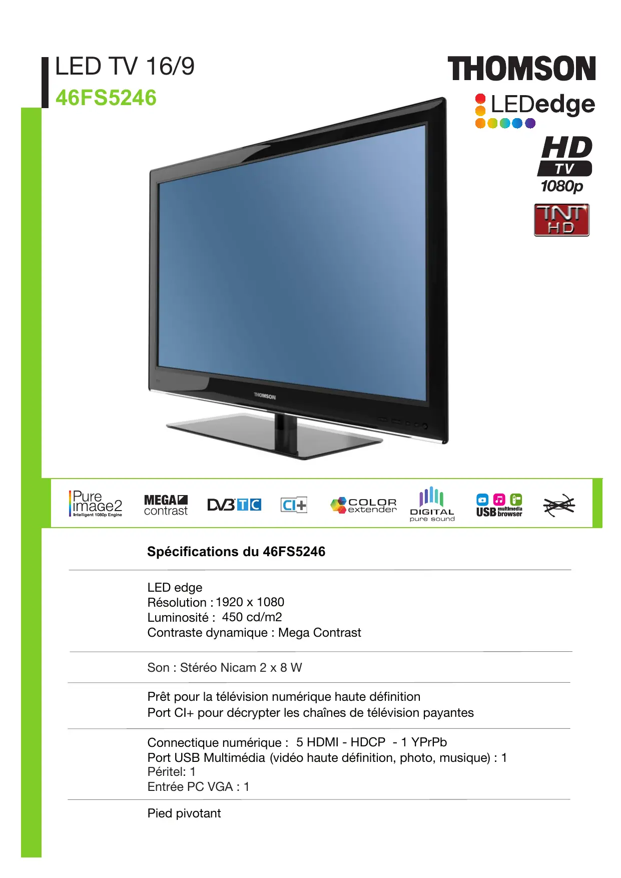 LED TV 16/9 46FS5246 Spécifications du 46FS5246 LED edge Résolution : 1920 x 1080 Luminosité : 450 cd/m2 Contraste dynamique : Mega Contrast Son : Stéréo Nicam 2 x 8 W Prêt pour la télévision numérique haute définition Port CI+ pour décrypter les chaînes de télévision payantes Connectique numérique : 5 HDMI - HDCP - 1 YPrPb Port USB Multimédia (vidéo haute définition, photo, musique) : 1 Péritel: 1 Entrée PC VGA : 1 Pied pivotant LED TV 16/9 46FS5246 Menu : langues Marque THOMSON IMAGE 116/46 16/9 LED edge 1920 x 1080 1360 x 768- 60Hz 178 / 178 50Hz 6 ms Oui 450 cd/m2 Mega Contrast Oui Oui Filtre en peigne 3D PAT / PAP Froid / Normal / Chaud zoom 16:9 / format 16:9/ format 4:3/ cinérama / zoom up 16:9 / zoom 14:9 Technologie d’amélioration d’image Pure image 2 Intelligent 1080p Engine Taille d’écran: diagonale (cm/pouce) Catégorie Type d’écran Résolution Résolution VGA max Angle de vision horizontal & vertical Fréquence Temps de réponse (gris à gris) Réduction du bruit Luminosité Contraste dynamique Contrôle du format Autoformat 16/9 Traitement de l’image Multi-image Préréglages image Type de zoom SON Décodeur son Puissance musicale Enceintes intégrées (T/M/B) Système son Contrôle du son Effect sonore Réglage du volume casque Stéreo Nicam 2x8W -/2/Virtual Surround 100, 300, 1k, 3k, 8k Multimédia / Cinéma / Musique / Voix / Personnel