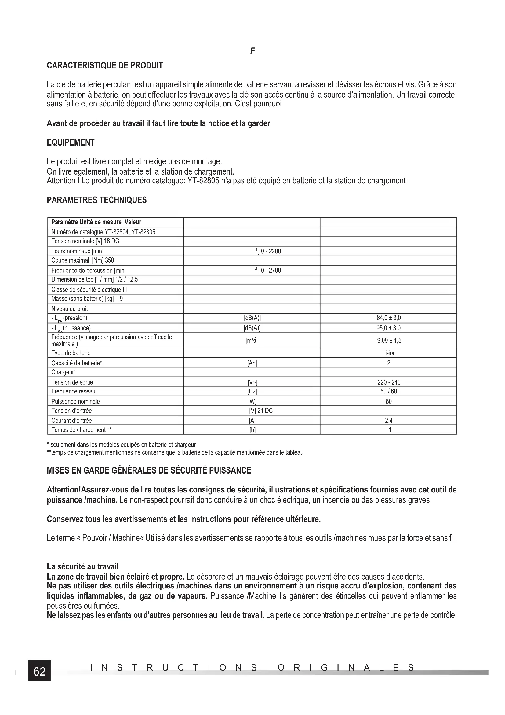 La clé de batterie percutant est un appareil simple alimenté de batterie servant à revisser et dévisser les écrous et vis. Grâce à son alimentation à batterie, on peut eff ectuer les travaux avec la clé son accès continu à la source d’alimentation. Un travail correcte, sans faille et en sécurité dépend d’une bonne exploitation. C’est pourquoi Avant de procéder au travail il faut lire toute la notice et la garder EQUIPEMENT Le produit est livré complet et n’exige pas de montage. On livre également, la batterie et la station de chargement. Attention ! Le produit de numéro catalogue: YT-82805 n’a pas été équipé en batterie et la station de chargement PARAMETRES TECHNIQUES Paramètre Unité de mesure Valeur Numéro de catalogue YT-82804, YT-82805 Tension nominale [V] 18 DC Tours nominaux [min