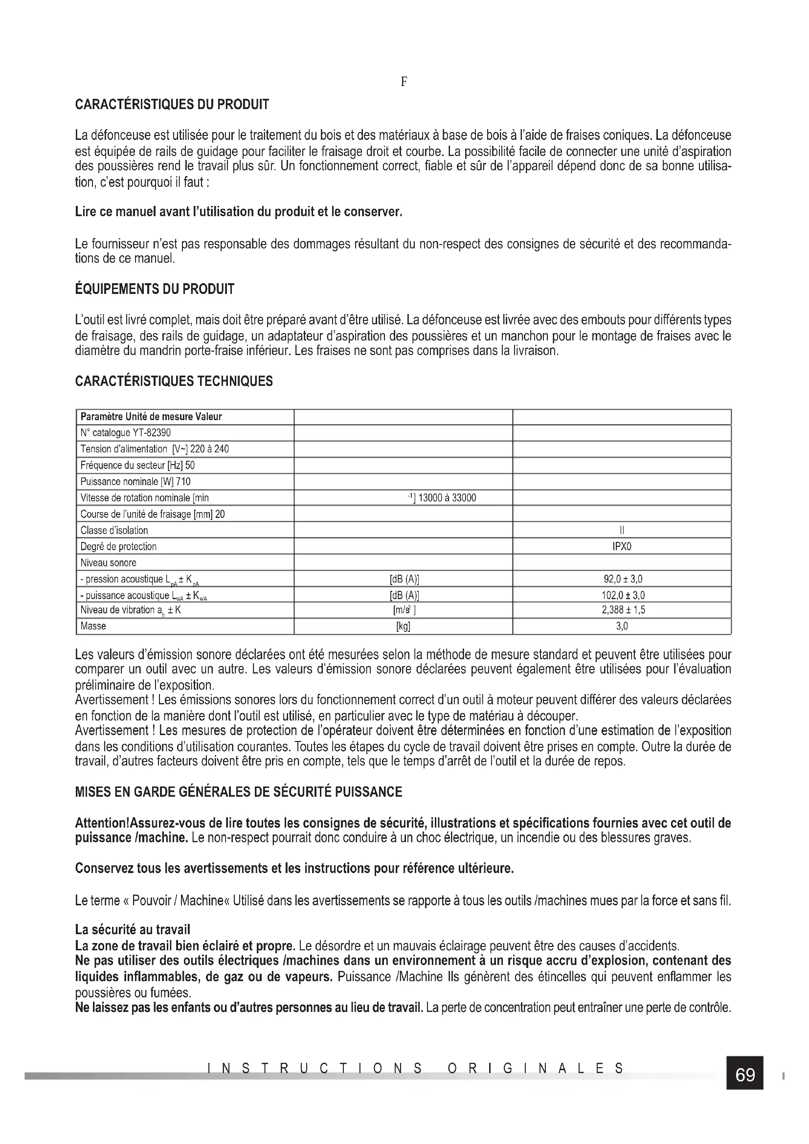 INSTRUCTIONS ORIGINALES surfaces de préhension ne permettent pas les outils commande et de contrôle en toute sécurité /machine dans des situations dangereuses. Réparation Réparation d›outils électriques /machine ne bénéfi cient des facilités, en utilisant uniquement des pièces de rechange d’origine. Cela permettra d’assurer la sécurité de l’outil approprié. AVERTISSEMENTS SUPPLÉMENTAIRES CONCERNANT LA SÉCURITÉ DES DÉFONCEUSES Tenir l’outil par les surfaces isolées de la poignée, car l’outil peut entrer en contact avec son propre cordon d’alimentation. Une fois le câble « sous tension » coupé, les parties métalliques de l’outil peuvent devenir « sous tension » et électrocuter l’opérateur. Utiliser des pinces ou d’autres moyens appropriés pour fi xer et maintenir la pièce à usiner sur une plate-forme stable. Tenir la pièce à usiner avec les mains ou d’autres parties du corps peut causer de l’instabilité et entraîner une perte de contrôle. Usage prévu de l’outil L’outil est utilisé pour le traitement du bois au moyen de fraises coniques qui sont guidées depuis le haut de la pièce à usiner le long de sa surface. Il est également possible de traiter des matériaux à base de bois tels que les plaques MDF, les panneaux de particules, le contreplaqué, etc. La transformation de matériaux autres que le bois et les matériaux à base de bois, tels que les plastiques ou les métaux, est interdite. Ne pas utiliser l’outil comme outil fi xe ou comme entraînement pour d’autres outils. L’utilisateur est responsable de tous les dommages résultant d’une mauvaise utilisation de l’outil. Risque résiduel Même si l’outil est utilisé correctement, il existe des risques résiduels qui ne peuvent être évités. La construction et l’utilisation de l’outil présentent les risques suivants : contact avec l’outil de coupe rotatif ; éjection de l’outil inséré ou de ses parties ; éjection de la poussière et des morceaux de bois ; inhalation de la poussière générée pendant le travail ; dommages auditifs si aucun dispositif de protection n’est utilisé ; électrocution en touchant des parties non isolées de l’outil. Le non-respect des instructions contenues dans ce mode d’emploi peut entraîner des risques liés à une utilisation non conforme. Consignes de sécurité supplémentaires Tenir toujours l’outil par les poignées isolées pendant le travail. L’outil inséré peut entrer en contact avec le cordon d’alimentation de l’outil ou avec un autre cordon « sous tension » caché. Un tel contact peut provoquer la mise sous tension de parties non isolées de l’outil et provoquer un choc de l’opérateur. Fixer toujours les pièces à usiner sur une base stable, par exemple une table de travail. Ne jamais tenir la pièce à usiner avec les mains, les jambes ou d’autres parties du corps. Le serrage correct de la pièce à usiner réduit le risque de perdre le contrôle de l’outil et le contact du corps avec les pièces mobiles de l’outil. Lors de l’usinage de pièces longues, les soutenir près du point d’usinage et près des extrémités de la pièce. Les éléments longs ont tendance à se plier sous leur propre poids. Les supports doivent être positionnés de manière à ce que les pièces de pliage des composants n’accrochent pas l’outil. Utiliser uniquement des fraises ayant le diamètre des mandrins indiqué dans le mode d’emploi. Ne pas retravailler le mandrin porte-fraise pour l’adapter à la douille de l’outil. Utiliser une douille et un écrou pour adapter le diamètre du mandrin porte-fraise. Avant d’installer la fraise, s’assurer que sa est supérieure ou égale à la vitesse de l’outil. Le traitement de certains matériaux peut générer de la poussière qui peut être nocive en cas d’inhalation. Toujours utiliser des masques anti-poussière pendant le fonctionnement. Dans la mesure du possible, il faut également raccorder l’outil à l’installation d’aspiration des poussières. Avant chaque utilisation, vérifi er que l’outil et l’outil inséré ne sont pas endommagés. Si des dommages sont remarqués, ne pas travailler jusqu’à ce qu’ils aient été réparés. Porter une attention particulière au cordon d’alimentation. Le cordon d’alimentation endommagé ne peut pas être réparé et doit être remplacé dans son intégralité. Le remplacement doit être eff ectué auprès du centre de service agréé. Toujours tirez sur la fi che, jamais sur le câble, lorsque vous débranchez le cordon d’alimentation de la prise de courant. Porter toujours un équipement de protection individuelle au travail : protection oculaire, protection auditive, masque anti-pous- sière, manches longues et jambes, gants, casque et chaussures complètes avec semelle antidérapante. Les cheveux longs devront être attachés. Tous les travaux de montage et de réglage doivent être eff ectués lorsque l’alimentation électrique de l’outil est coupée. La fi che du cordon d’alimentation de l’outil doit être débranchée de la prise de secteur. S’assurer que la gâchette de l’interrupteur d’alimenta- tion est en position arrêt avant de brancher l’outil à l’alimentation électrique. Avant d’utiliser la fraise, s’assurer que les arêtes de coupe ne sont pas endommagées et qu’elles sont correctement aff ûtées. Des arêtes de coupe défectueuses peuvent faire sauter la fraise hors de la pièce, provoquer des résultats de travail inégaux et provoquer des fi ssures sur la fraise. Des arêtes fl oues nécessiteront une force de serrage accrue de la fraise contre le matériau à usiner, ce qui peut provoquer la combustion du matériau et la fi ssuration de la fraise. Ne pas utiliser de fraises d’un diamètre supérieur à celui du trou dans la base. Après le montage dans la broche de la défonceuse, la fraise ne doit pas bloquer l’aba