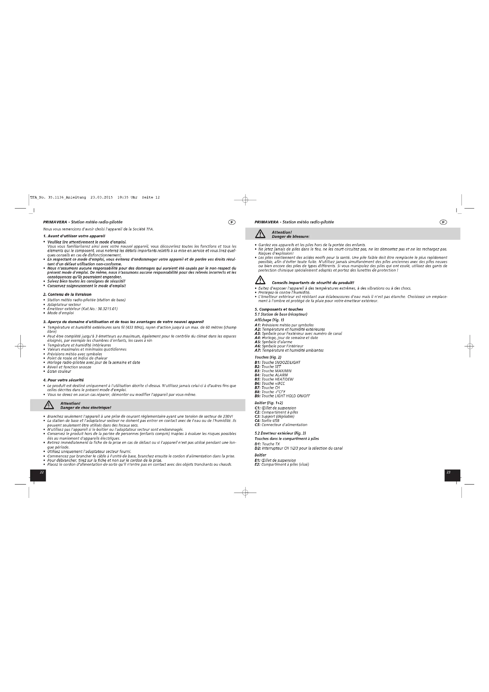 Placez le cordon d'alimentation de sorte qu'il n'entre pas en contact avec des objets tranchants ou chauds. TFA_No. 35.1136_Anleitung 23.03.2015 10:35 Uhr Seite 122524 PRIMAVERA - Station météo radio-pilotée